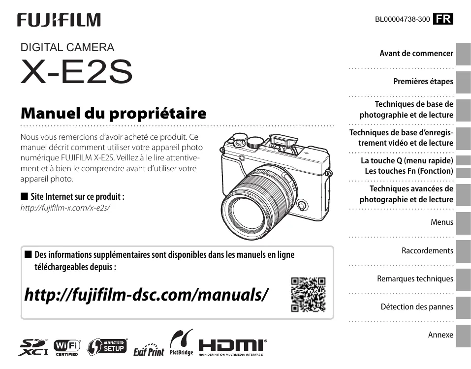 DIGITAL CAMERA X-E2S Manuel du propriétaire Nous vous remercions d’avoir acheté ce produit. Ce manuel décrit comment utiliser votre appareil photo numérique FUJIFILM X-E2S. Veillez à le lire attentivement et à bien le comprendre avant d’utiliser votre appareil photo.