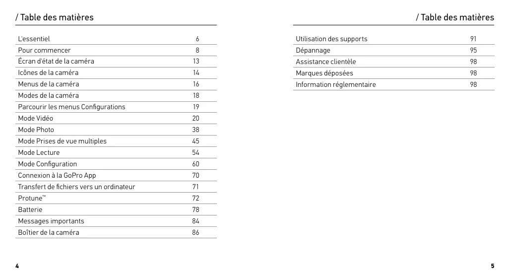 / Icônes de la caméra / Icônes de la caméra Détection faible luminosité automatique Langue Mode Configuration DEL Netteté Arrêt automatique Boucle Obturateur Bips Méga-pixels Photo unique Rafale de photos Mode Prises de vue multiples Posemètre Couleur Photos continues Date/Heure Mode par défaut Supprimer Compensation de la valeur d'exposition Night Lapse Nuit Accéléré Affichage à l’écran Orientation Mode Photo Mode Lecture Champ de vision Protune Images par seconde QuikCapture Intervalle Fréquence Accéléré Écran tactile Vidéo Vidéo + Photo Format vidéo Mode vidéo Résolution vidéo Équilibre des blancs Sans fil Limite ISO