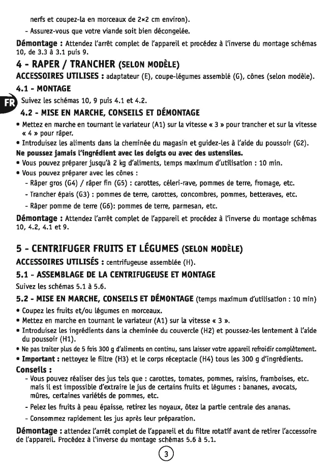 - Vous pouvez préparer avec les cônes : - Râper gros (G4) /râper fin (G5) : carottes, céleri-rave, pommes de terre, fromage, etc. - Trancher épais (G3) : pommes de terre, carottes, concombres, pommes, betteraves, etc. - Râper pomme de terre (G6): pommes de terre, parmesan, etc. Démontage : Attendez rarrêt complet de rappareil et procédez à rinverse du montage schémas 10, 4.2, 4.1 et 9.