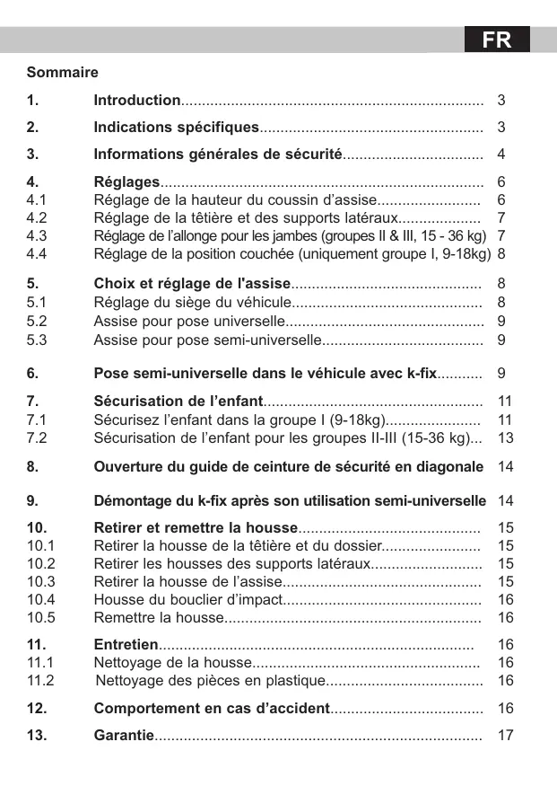Réglages Réglage de la hauteur du coussin d’assise Réglage de la têtière et des supports latéraux Réglage de l’allonge pour les jambes (groupes II & III, 15 - 36 kg) Réglage de la position couchée (uniquement groupe I, 9-18kg) Choix et réglage de l'assise Réglage du siège du véhicule Assise pour pose universelle Assise pour pose semi-universelle
