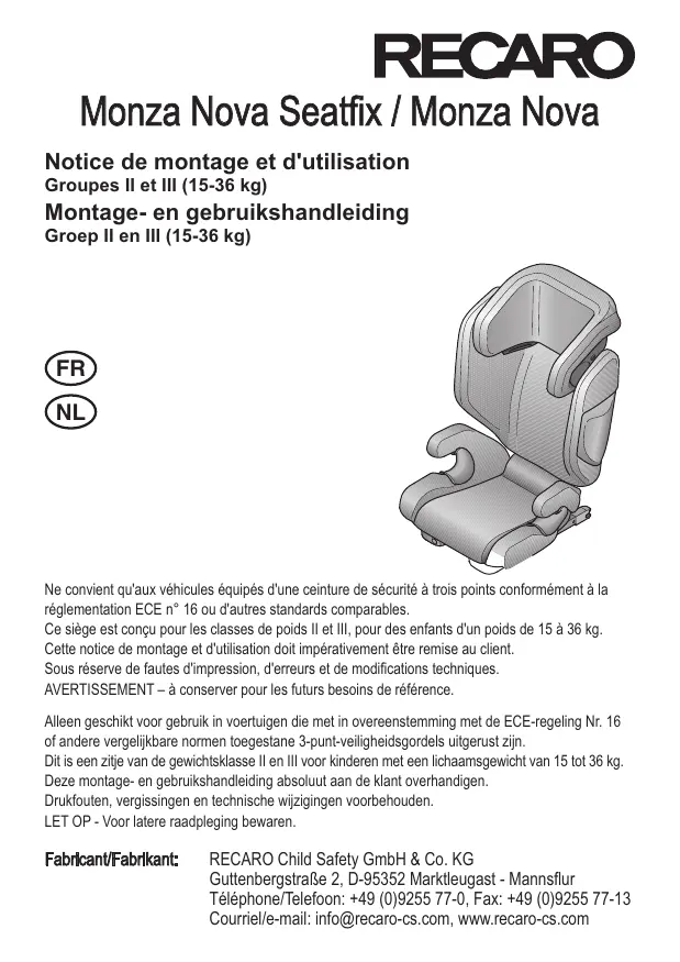 MONZA NOVA SEATFIX - Siège auto RECARO - Notice d'utilisation et mode d'emploi gratuit