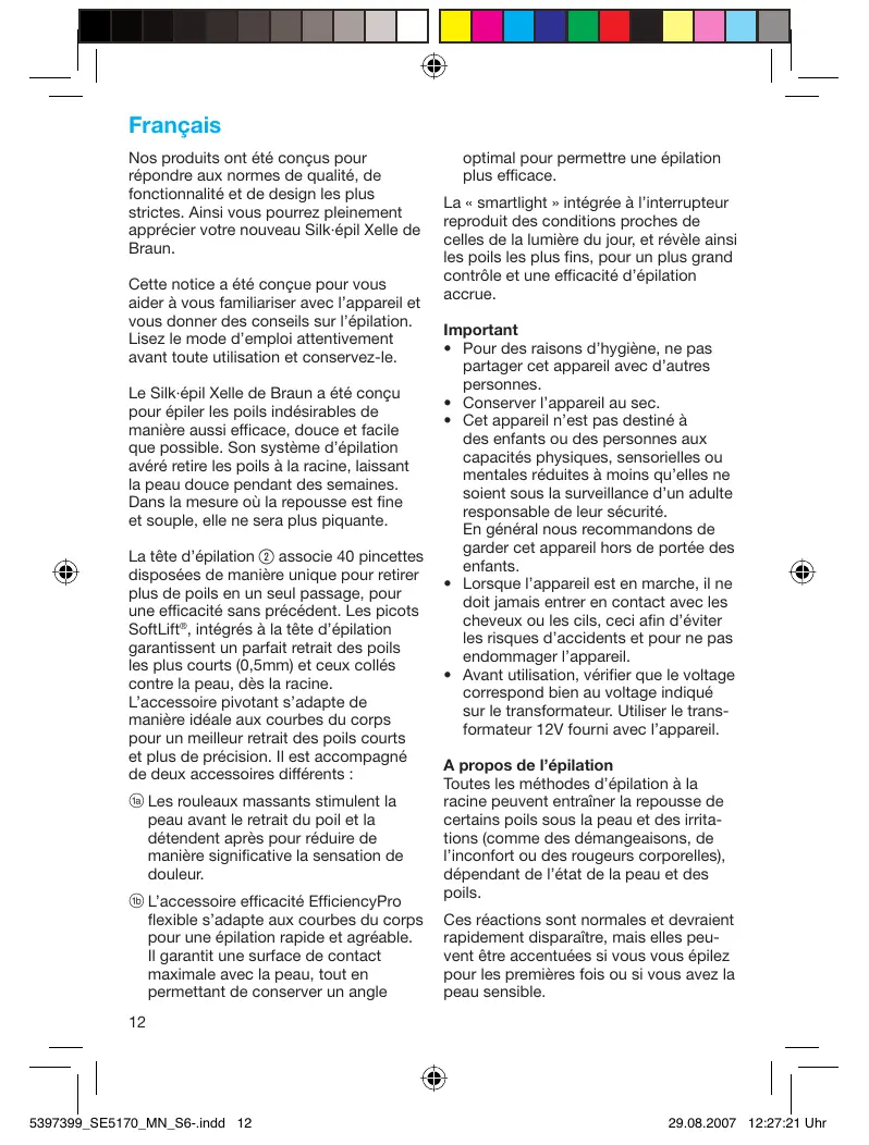 Français Nos produits ont été conçus pour répondre aux normes de qualité, de fonctionnalité et de design les plus strictes. Ainsi vous pourrez pleinement apprécier votre nouveau Silk·épil Xelle de Braun. Cette notice a été conçue pour vous aider à vous familiariser avec l’appareil et vous donner des conseils sur l’épilation. Lisez le mode d’emploi attentivement avant toute utilisation et conservez-le. Le Silk·épil Xelle de Braun a été conçu pour épiler les poils indésirables de manière aussi efficace, douce et facile que possible. Son système d’épilation avéré retire les poils à la racine, laissant la peau douce pendant des semaines. Dans la mesure où la repousse est fine et souple, elle ne sera plus piquante. La tête d’épilation 2 associe 40 pincettes disposées de manière unique pour retirer plus de poils en un seul passage, pour une efficacité sans précédent. Les picots SoftLift®, intégrés à la tête d’épilation garantissent un parfait retrait des poils les plus courts (0,5mm) et ceux collés contre la peau, dès la racine. L’accessoire pivotant s’adapte de manière idéale aux courbes du corps pour un meilleur retrait des poils courts et plus de précision. Il est accompagné de deux accessoires différents : A Les rouleaux massants stimulent la peau avant le retrait du poil et la détendent après pour réduire de manière significative la sensation de douleur. a L’accessoire efficacité EfficiencyPro flexible s’adapte aux courbes du corps pour une épilation rapide et agréable. Il garantit une surface de contact maximale avec la peau, tout en permettant de conserver un angle optimal pour permettre une épilation plus efficace. La « smartlight » intégrée à l’interrupteur reproduit des conditions proches de celles de la lumière du jour, et révèle ainsi les poils les plus fins, pour un plus grand contrôle et une efficacité d’épilation accrue. Important