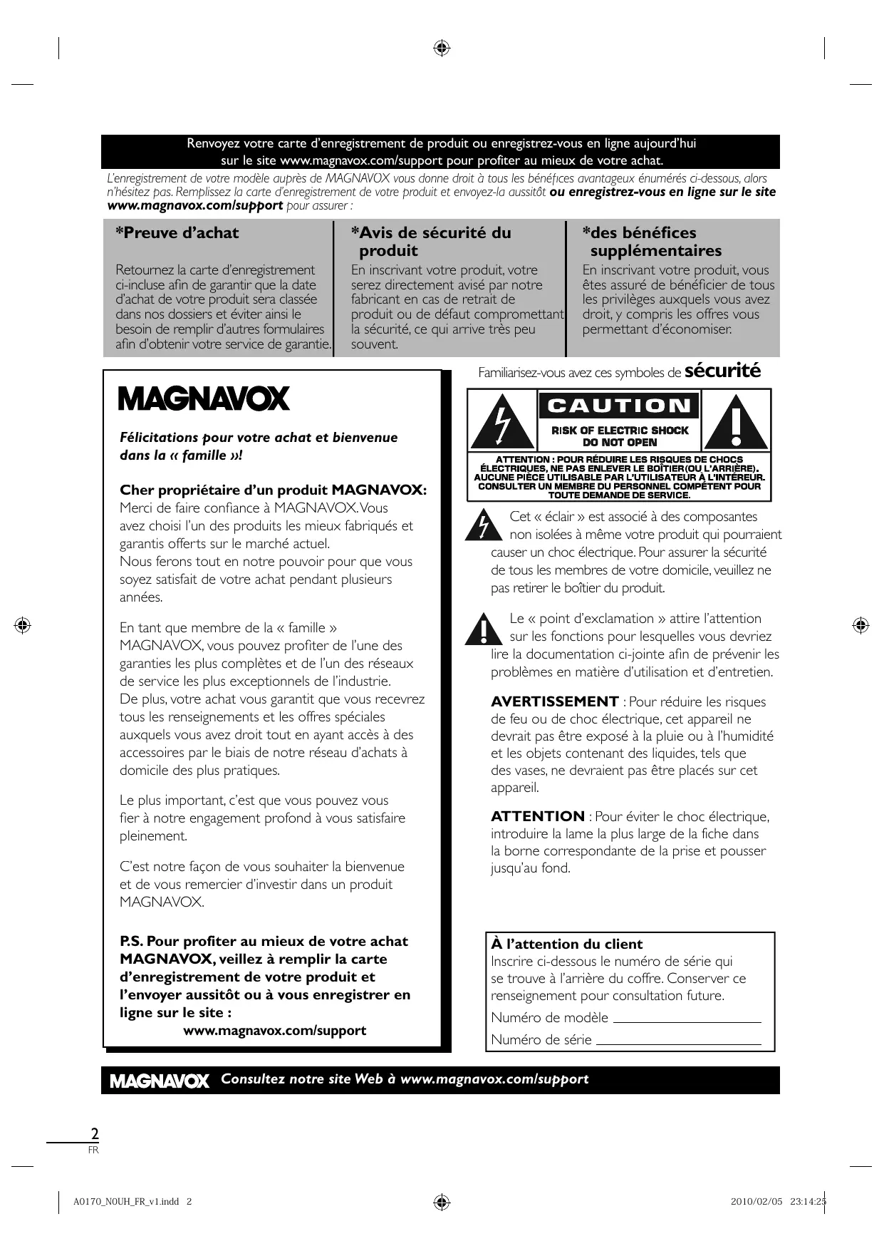de feu ou de choc électrique, cet appareil ne devrait pas être exposé à la pluie ou à l’humidité et les objets contenant des liquides, tels que des vases, ne devraient pas être placés sur cet appareil. ATTENTION : Pour éviter le choc électrique, introduire la lame la plus large de la fiche dans la borne correspondante de la prise et pousser jusqu’au fond. À l’attention du client Inscrire ci-dessous le numéro de série qui se trouve à l’arrière du coffre. Conserver ce renseignement pour consultation future. Numéro de modèle Numéro de série Consultez notre site Web à www.magnavox.com/support