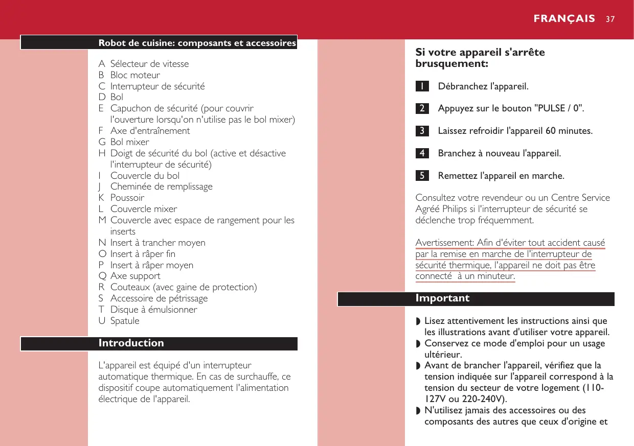 N'utilisez pas l'appareil si le cordon d'alimentation, la fiche ou les autres pièces sont détériorés. Si le cordon d'alimentation est endommagé, il ne doit être remplacé que par Philips, par un Centre Service Agréé Philips ou par des personnes qualifiées pour éviter tout accident. Avant la première utilisation, nettoyez toutes les pièces en contact avec les aliments. Ne dépassez pas les quantités et le temps de préparation indiqués dans le tableau et les recettes . Ne dépassez pas les quantités et les temps d'utilisation indiqués dans le tableau. Débranchez l'appareil immédiatement après utilisation. Ne mettez jamais vos doigts ou tout autre objet, (par ex. la spatule), dans la cheminée de remplissage pour pousser les ingrédients sans avoir au préalable arrêté l'appareil. Utilisez uniquement le poussoir. Débranchez toujours l'appareil avant mettre vos doigts ou tout autre objet dans le bol mixer (par ex. la spatule). Tenez l'appareil hors de portée des enfants. Ne laissez jamais l'appareil fonctionner sans surveillance. N'arrêtez jamais l'appareil en tournant le couvercle. Arrêtez l'appareil seulement en appuyant sur le bouton PULSE / 0.