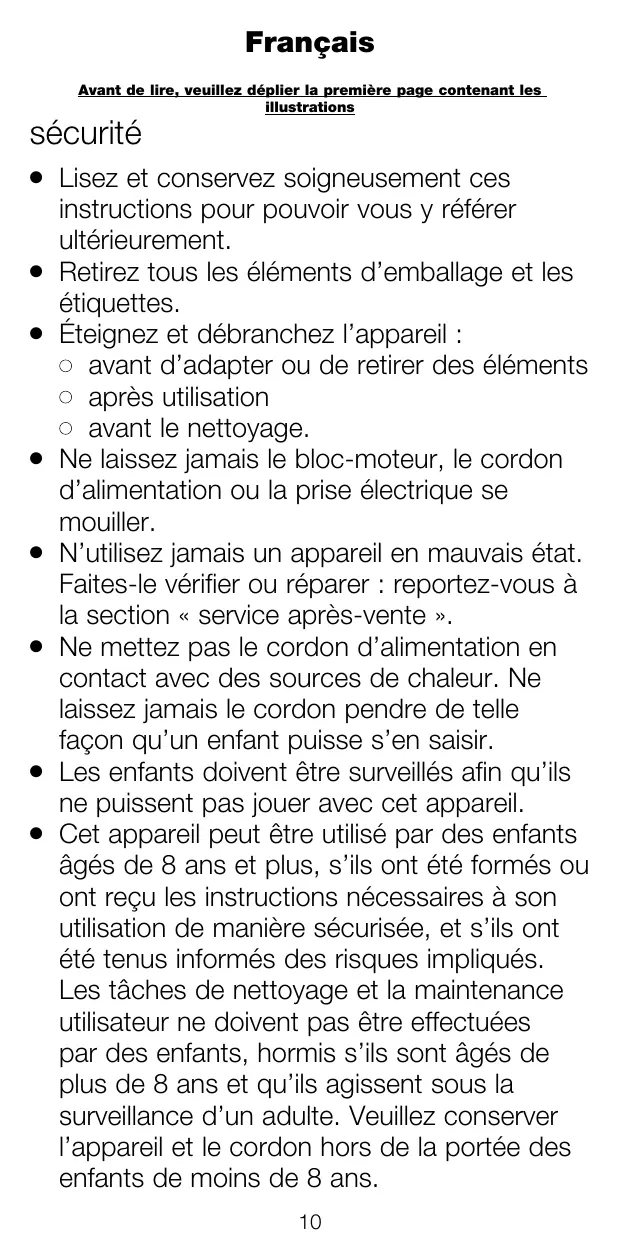 Retirez tous les éléments d’emballage et les étiquettes. Éteignez et débranchez l’appareil : avant d’adapter ou de retirer des éléments après utilisation avant le nettoyage. Ne laissez jamais le bloc-moteur, le cordon d’alimentation ou la prise électrique se mouiller. N’utilisez jamais un appareil en mauvais état. Faites-le vérifier ou réparer : reportez-vous à la section « service après-vente ». Ne mettez pas le cordon d’alimentation en contact avec des sources de chaleur. Ne laissez jamais le cordon pendre de telle façon qu’un enfant puisse s’en saisir. Les enfants doivent être surveillés afin qu’ils ne puissent pas jouer avec cet appareil. Cet appareil peut être utilisé par des enfants âgés de 8 ans et plus, s’ils ont été formés ou ont reçu les instructions nécessaires à son utilisation de manière sécurisée, et s’ils ont été tenus informés des risques impliqués. Les tâches de nettoyage et la maintenance utilisateur ne doivent pas être effectuées par des enfants, hormis s’ils sont âgés de plus de 8 ans et qu’ils agissent sous la surveillance d’un adulte. Veuillez conserver l’appareil et le cordon hors de la portée des enfants de moins de 8 ans. 10