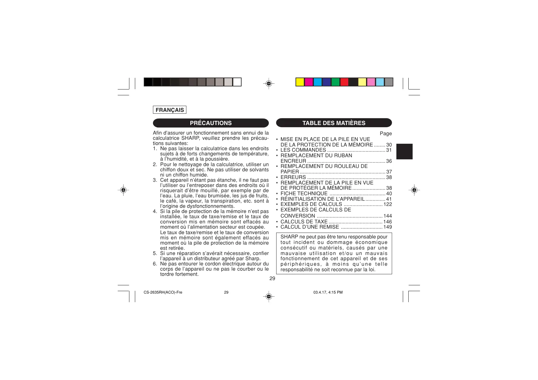 03.3.12, 2:03 PM FRANÇAIS PRÉCAUTIONS TABLE DES MATIÈRES Afin d’assurer un fonctionnement sans ennui de la calculatrice SHARP, veuillez prendre les précautions suivantes: 1. Ne pas laisser la calculatrice dans les endroits sujets à de forts changements de température, à l’humidité, et à la poussière. 2. Pour le nettoyage de la calculatrice, utiliser un chiffon doux et sec. Ne pas utiliser de solvants ni un chiffon humide. 3. Cet appareil n’étant pas étanche, il ne faut pas l’utiliser ou l’entreposer dans des endroits où il risquerait d’être mouillé, par exemple par de l’eau. La pluie, l’eau brumisée, les jus de fruits, le café, la vapeur, la transpiration, etc. sont à l’origine de dysfonctionnements. 4. Si la pile de protection de la mémoire n’est pas installée, le taux de taxe/remise et le taux de conversion mis en mémoire sont effacés au moment où l’alimentation secteur est coupée. Le taux de taxe/remise et le taux de conversion mis en mémoire sont également effacés au moment où la pile de protection de la mémoire est retirée. 5. Si une réparation s’avérait nécessaire, confier l’appareil à un distributeur agréé par Sharp. 6. Ne pas entourer le cordon électrique autour du corps de l’appareil ou ne pas le courber ou le tordre fortement.