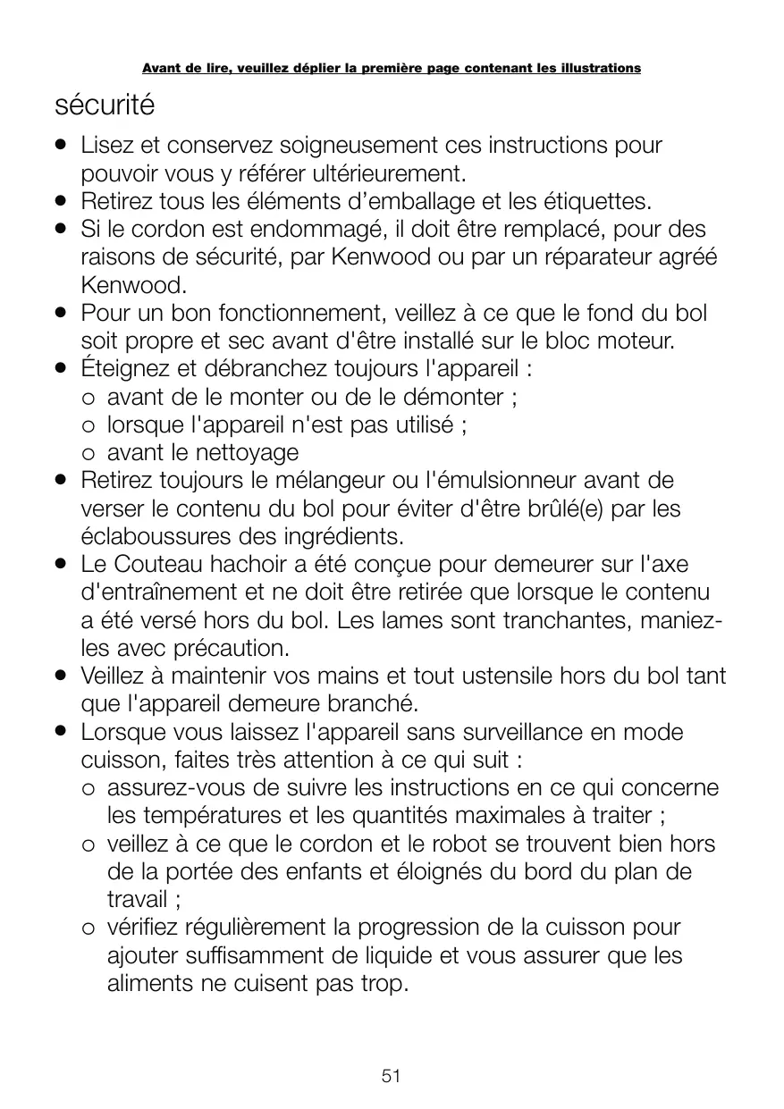Avant de lire, veuillez déplier la première page contenant les illustrations sécurité Lisez et conservez soigneusement ces instructions pour pouvoir vous y référer ultérieurement. O Retirez tous les éléments d’emballage et les étiquettes. O Si le cordon est endommagé, il doit être remplacé, pour des raisons de sécurité, par Kenwood ou par un réparateur agréé Kenwood. O Pour un bon fonctionnement, veillez à ce que le fond du bol soit propre et sec avant d'être installé sur le bloc moteur. O Éteignez et débranchez toujours l'appareil : { avant de le monter ou de le démonter ; { lorsque l'appareil n'est pas utilisé ; { avant le nettoyage O Retirez toujours le mélangeur ou l'émulsionneur avant de verser le contenu du bol pour éviter d'être brûlé(e) par les éclaboussures des ingrédients. O Le Couteau hachoir a été conçue pour demeurer sur l'axe d'entraînement et ne doit être retirée que lorsque le contenu a été versé hors du bol. Les lames sont tranchantes, maniezles avec précaution. O Veillez à maintenir vos mains et tout ustensile hors du bol tant que l'appareil demeure branché. O Lorsque vous laissez l'appareil sans surveillance en mode cuisson, faites très attention à ce qui suit : { assurez-vous de suivre les instructions en ce qui concerne les températures et les quantités maximales à traiter ; { veillez à ce que le cordon et le robot se trouvent bien hors de la portée des enfants et éloignés du bord du plan de travail ; { vérifiez régulièrement la progression de la cuisson pour ajouter suffisamment de liquide et vous assurer que les aliments ne cuisent pas trop.