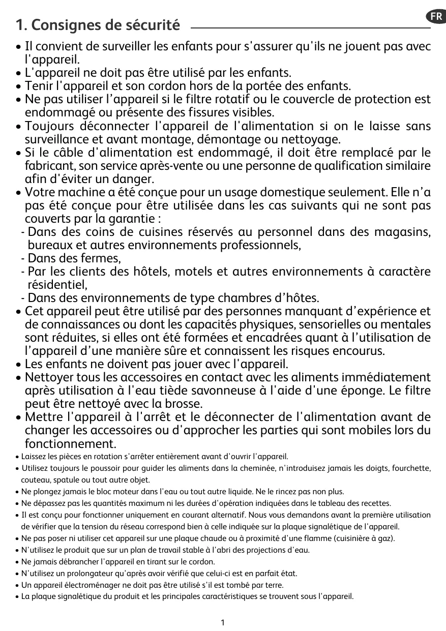 • L'appareil ne doit pas être utilisé par les enfants. • Tenir l'appareil et son cordon hors de la portée des enfants. • Ne pas utiliser l’appareil si le filtre rotatif ou le couvercle de protection est endommagé ou présente des fissures visibles. • Toujours déconnecter l'appareil de l'alimentation si on le laisse sans surveillance et avant montage, démontage ou nettoyage. • Si le câble d'alimentation est endommagé, il doit être remplacé par le fabricant, son service après-vente ou une personne de qualification similaire afin d'éviter un danger. • Votre machine a été conçue pour un usage domestique seulement. Elle n’a pas été conçue pour être utilisée dans les cas suivants qui ne sont pas couverts par la garantie : - Dans des coins de cuisines réservés au personnel dans des magasins, bureaux et autres environnements professionnels, - Dans des fermes, - Par les clients des hôtels, motels et autres environnements à caractère résidentiel, - Dans des environnements de type chambres d’hôtes. • Cet appareil peut être utilisé par des personnes manquant d’expérience et de connaissances ou dont les capacités physiques, sensorielles ou mentales sont réduites, si elles ont été formées et encadrées quant à l’utilisation de l’appareil d’une manière sûre et connaissent les risques encourus. • Les enfants ne doivent pas jouer avec l'appareil. • Nettoyer tous les accessoires en contact avec les aliments immédiatement après utilisation à l'eau tiède savonneuse à l'aide d'une éponge. Le filtre peut être nettoyé avec la brosse. • Mettre l'appareil à l'arrêt et le déconnecter de l'alimentation avant de changer les accessoires ou d'approcher les parties qui sont mobiles lors du fonctionnement. • Laissez les pièces en rotation s'arrêter entièrement avant d'ouvrir l'appareil. • Utilisez toujours le poussoir pour guider les aliments dans la cheminée, n'introduisez jamais les doigts, fourchette, couteau, spatule ou tout autre objet. • Ne plongez jamais le bloc moteur dans l'eau ou tout autre liquide. Ne le rincez pas non plus. • Ne dépassez pas les quantités maximum ni les durées d'opération indiquées dans le tableau des recettes. • Il est conçu pour fonctionner uniquement en courant alternatif. Nous vous demandons avant la première utilisation de vérifier que la tension du réseau correspond bien à celle indiquée sur la plaque signalétique de l'appareil. • Ne pas poser ni utiliser cet appareil sur une plaque chaude ou à proximité d'une flamme (cuisinière à gaz). • N'utilisez le produit que sur un plan de travail stable à l'abri des projections d'eau. • Ne jamais débrancher l'appareil en tirant sur le cordon. • N'utilisez un prolongateur qu'après avoir vérifié que celui-ci est en parfait état. • Un appareil électroménager ne doit pas être utilisé s'il est tombé par terre. • La plaque signalétique du produit et les principales caractéristiques se trouvent sous l'appareil. 1