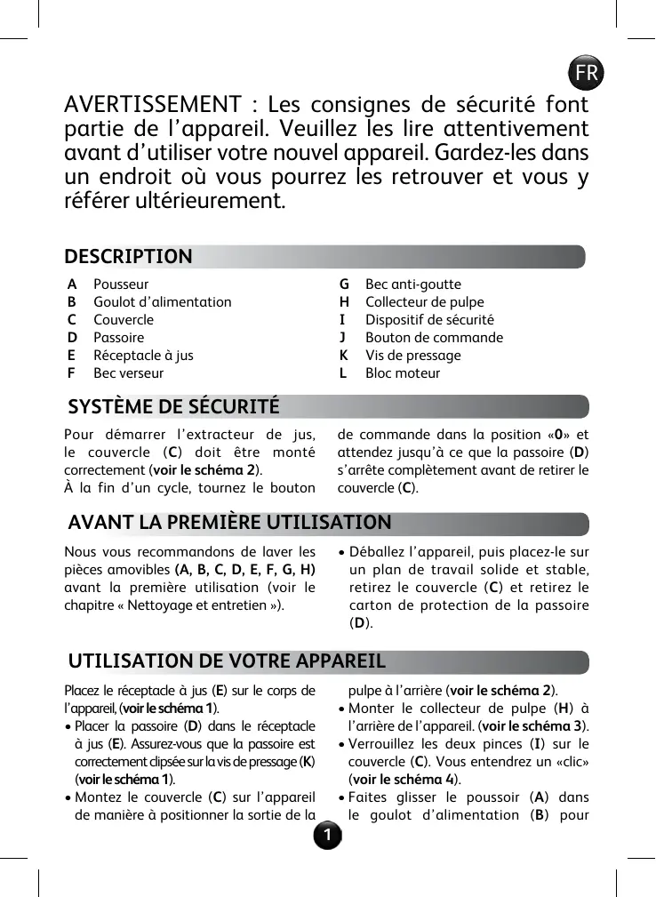 AVANT LA PREMIÈRE UTILISATION Nous vous recommandons de laver les pièces amovibles (A, B, C, D, E, F, G, H) avant la première utilisation (voir le chapitre « Nettoyage et entretien »).