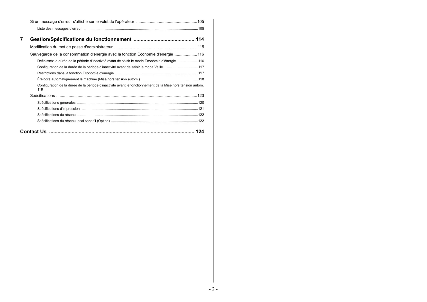 - Gestion/Spécifications du fonctionnement p. 114