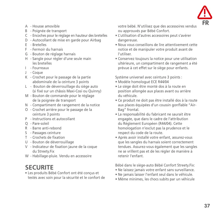 - Housse amovible - Poignée de transport - Encoches pour le réglage en hauteur des bretelles - Autocollant de mise en garde pour Airbag - Bretelles - Fermoir du harnais - Bouton de réglage harnais - Sangle pour régler d’une seule main les bretelles - Fourreaux - Coque - Crochet pour le passage de la partie abdominale de la ceinture 3 points - Bouton de déverrouillage du siège auto (si fixé sur un châssis Maxi-Cosi ou Quinny) - Bouton de commande pour le réglage de la poignée de transport - Compartiment de rangement de la notice - Crochet arrière pour le passage de la ceinture 3 points - Instructions et autocollant - Pare-soleil - Barre anti-rebond - Passages ceinture - Crochets de fixation - Bouton de déverrouillage - Indicateur de fixation jaune de la coque du Streety.Fix - Habillage-pluie. Vendu en accessoire SECURITE