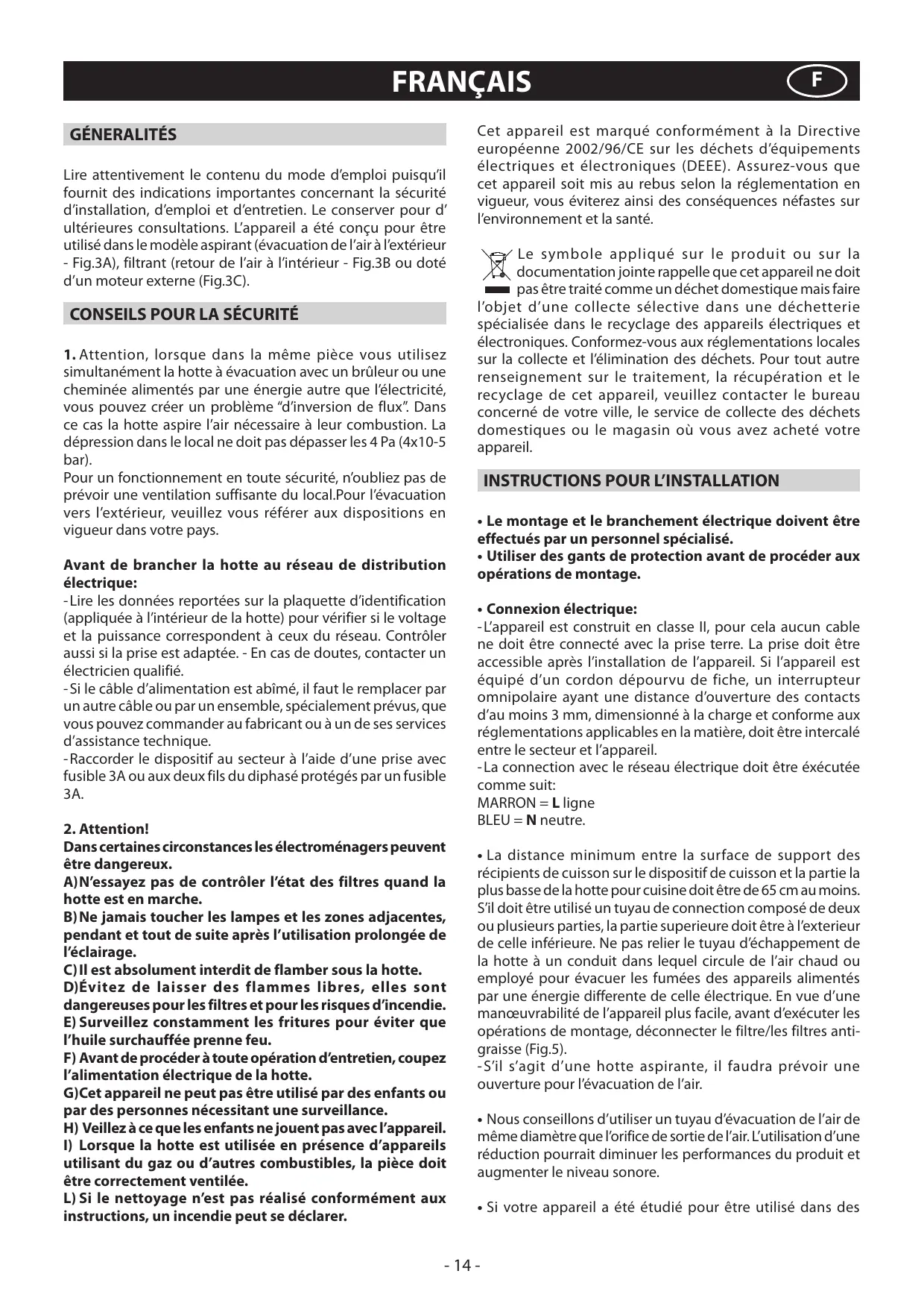Dans certaines circonstances les électroménagers peuvent ÐUSFEBOHFSFVY A) N’essayez pas de contrôler l’état des filtres quand la hotte est en marche. B) Ne jamais toucher les lampes et les zones adjacentes, pendant et tout de suite après l’utilisation prolongée de l’éclairage. C) Il est absolument interdit de flamber sous la hotte. D)Évitez de laisser des flammes libres, elles sont dangereuses pour les filtres et pour les risques d’incendie. E) Surveillez constamment les fritures pour éviter que l’huile surchauffée prenne feu.