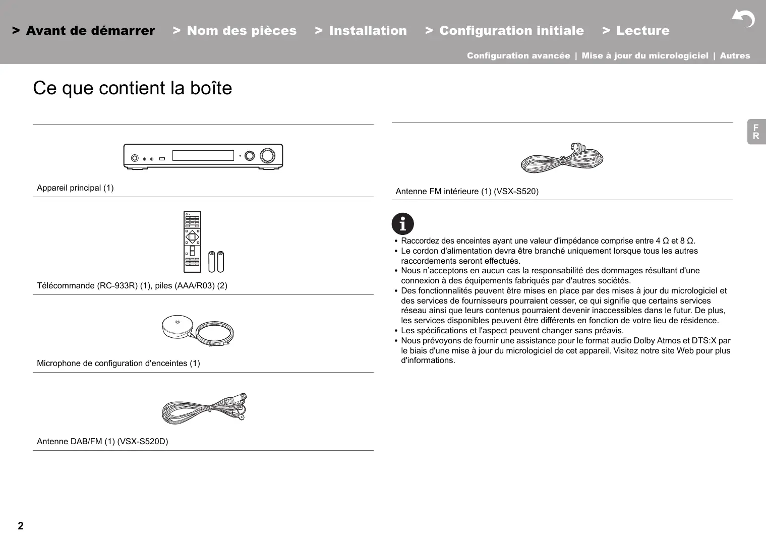 Ce que contient la boîte 2 Nom des pièces Panneau frontal 3 Panneau arrière 4 Télécommande 6 Afficheur 7 Installation 1. Raccorder les enceintes 8 2. Raccorder le téléviseur 11 3. Raccorder les appareils AV HDMI 12 4. Raccorder les Appareils Audio 13 5. Raccorder d'autres câbles 14 Configuration initiale Configuration initiale avec l'assistant de démarrage automatique 15 Lecture Lecture d'un appareil AV 18 Radio Internet 19 Spotify 21 Music Server 22 Périphérique de stockage USB 24 AirPlay® 26 Lecture BLUETOOTH® 27 Écoute de la radio FM/DAB 28 Modes d'écoute 31 AV Adjust 40 Configuration avancée System Setup 42 MCACC 51 Network/Bluetooth 54 Mise à jour du micrologiciel Mise à jour du micrologiciel 57 Autres Dépannage 60 Caractéristiques générales 65 About HDMI 67 Licence et Marque commerciale 68