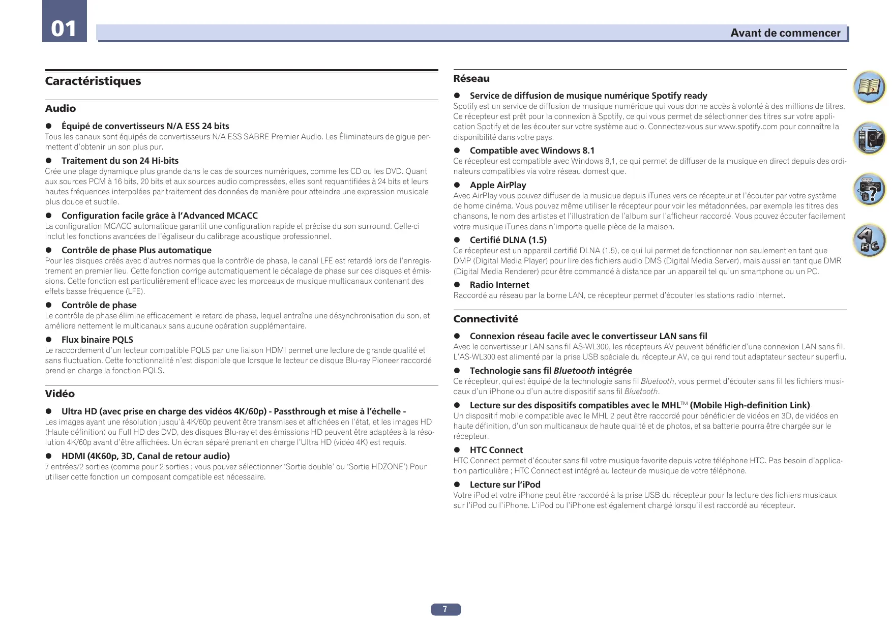 Informations supplémentaires vTuner Index des fonctions Consultez la section Ecoute des stations radio Internet à la page 57. DLNA Mode de fonctionnement Consultez la section Configuration du mode de fonctionnement à la page 40. Consultez la section À propos de la lecture en réseau à la page 60. AVNavigator AirPlay Consultez la section Comment utiliser l’AVNavigator intégré à la page 36. Consultez la section Utilisation d’AirPlay sur un iPod touch, iPhone, iPad et iTunes à la page 56. ECO MODE 1, 2 LAN sans fil Consultez la section Utilisation des effets Advanced surround à la page 53. Consultez la section Raccordement à un réseau LAN sans fil à la page 33. HDZONE Lecture d’un fichier audio en haute définition Consultez la section À propos des formats de fichiers lisibles à la page 61. Consultez la section Lecture d’un dispositif USB à la page 45. Consultez la section Configuration MULTI-ZONE à la page 30. HTC Connect Diaporama Consultez la section À propos d’HTC Connect à la page 57. Consultez la section Lecture de fichiers photo enregistrés sur un dispositif USB à la page 45. Pandora ADAPTATEUR Bluetooth Consultez la section Écoute de la radio Internet Pandora à la page 58. Consultez la section Lecture de musique à l’aide de la technologie sans fil Bluetooth à la page 48. ZONE de lecture ARC (Canal de retour audio) Consultez la section Configuration de la ZONE pour la lecture à la page 95. Consultez la section Réglage de l’HDMI à la page 63. Pass through/Conversion à la hausse 4 K Retard automatique Consultez la section À propos de l’HDMI à la page 23. Consultez la section Réglage des options audio à la page 67. MCACC automatique intégrale Gain Hauteur (option Hauteur de Dolby Pro Logic llz) Consultez la section Obtention automatique d’un réglage sonore optimal (Full Auto MCACC) à la page 37. Consultez la section Réglage des options audio à la page 67. MCACC automatique (Expert) Surround arrière virtuel Consultez la section MCACC automatique (Expert) à la page 82. Consultez la section Réglage des options audio à la page 67. Configuration MCACC manuelle Virtuel Haut Consultez la section Configuration MCACC manuelle à la page 84. Consultez la section Réglage des options audio à la page 67. PQLS Virtuel large Consultez la section Réglage de la fonction PQLS à la page 64. Consultez la section Réglage des options audio à la page 67. Contrôle de phase Profondeur virtuelle Consultez la section Contrôle de phase pour un son de meilleure qualité à la page 54. Consultez la section Réglage des options audio à la page 67. Ondes stationnaires Convertisseur vidéo numérique Consultez la section Réglage des options audio à la page 67. Consultez la section Réglages des options vidéo à la page 69. Contrôle de phase Plus Cinéma pur Consultez la section Réglage des options audio à la page 67. Consultez la section Réglages des options vidéo à la page 69. Correction automatique du son Animé progressif Consultez la section Réglage des options audio à la page 67. Consultez la section Réglages des options vidéo à la page 69. ALC (Contrôle automatique des niveaux) Réglage vidéo évolué Consultez la section Lecture automatique à la page 52. Consultez la section Réglages des options vidéo à la page 69. Surround avant évolué Extinction automatique Consultez la section Écoute de sources variées grâce aux divers modes d’écoute à la page 52. Consultez la section Menu Autre configuration à la page 93. Correction sonore Air Consultez la section Écoute de sources variées grâce aux divers modes d’écoute à la page 52. Optimisation des dialogues Consultez la section Réglage des options audio à la page 67. Internet radio Consultez la section Ecoute des stations radio Internet à la page 57.