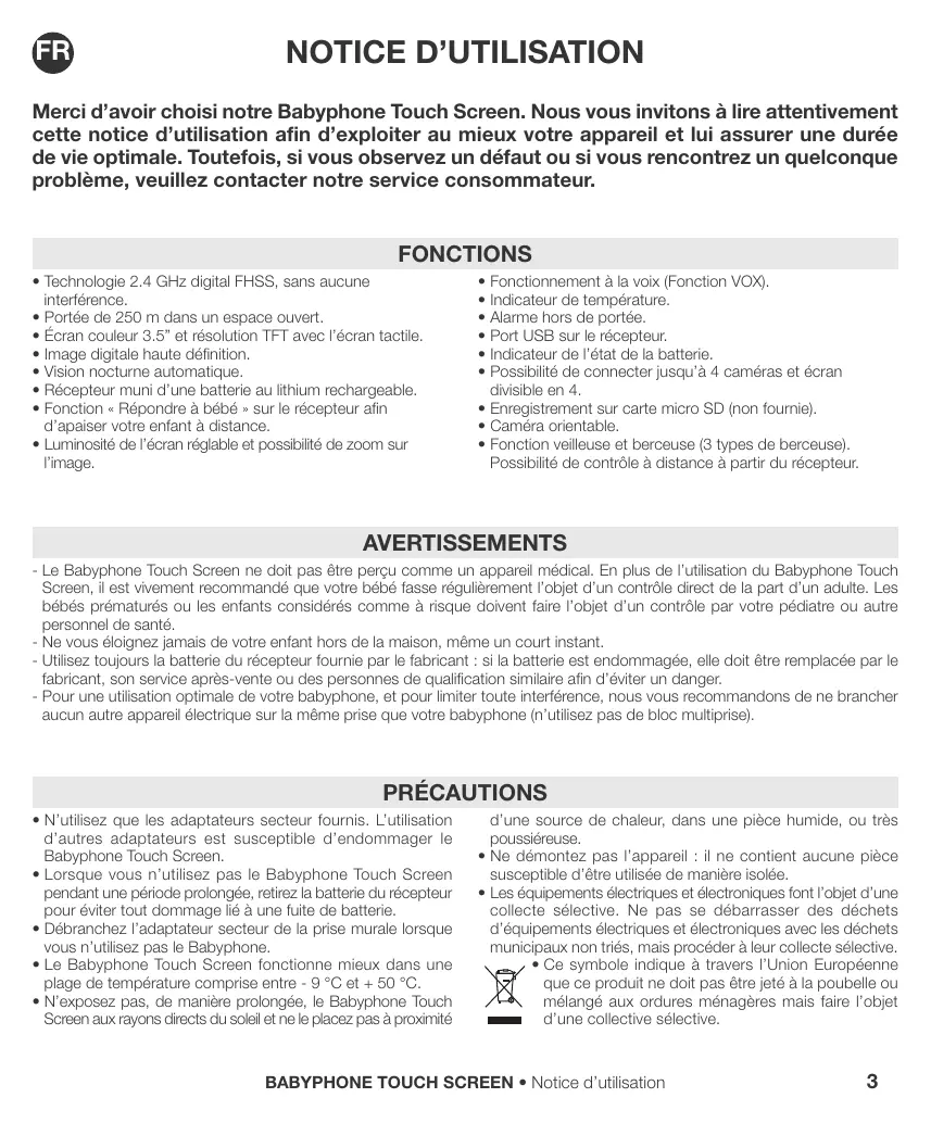 BABYPHONE TOUCH SCREEN • Notice d’utilisation