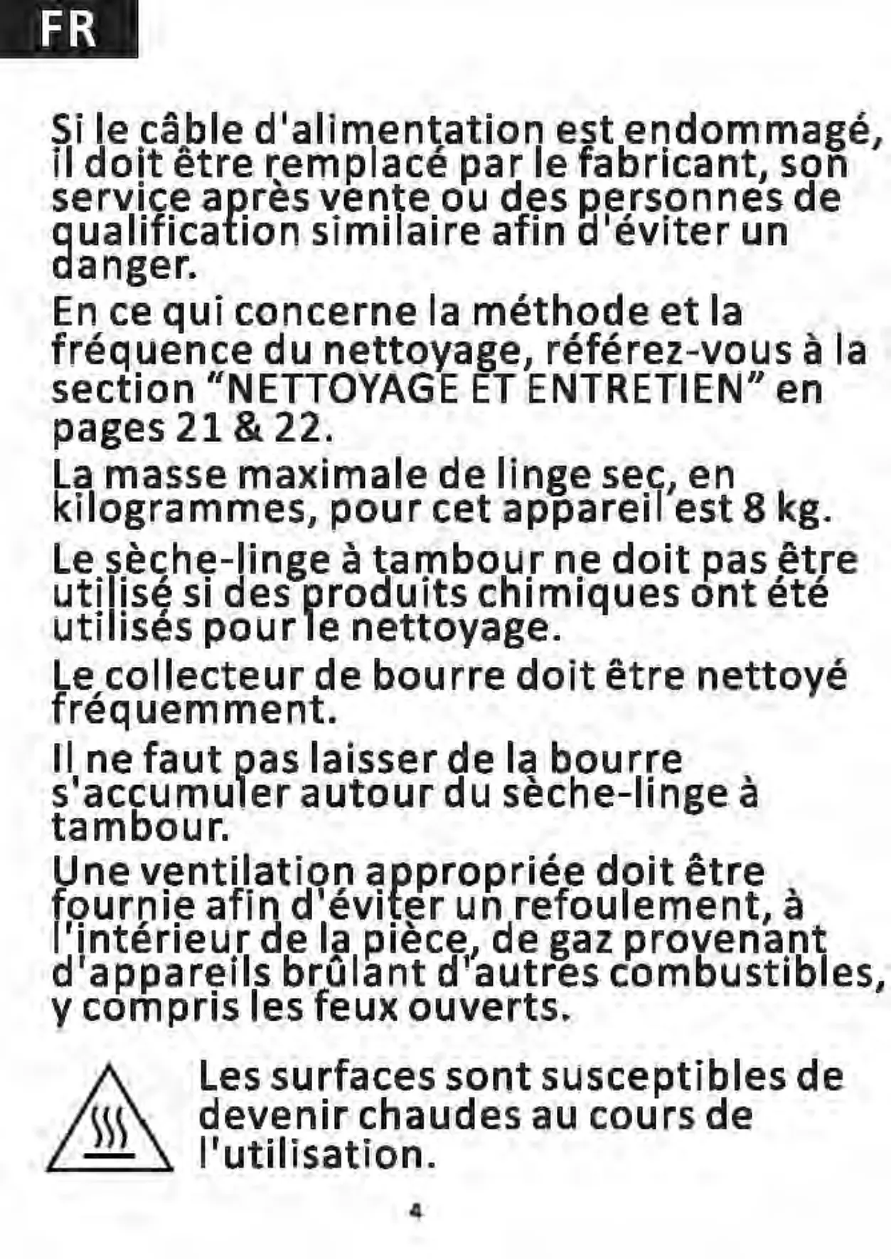 Si le câble d'alimentation est endommagé, il doit être remplacé par le fabricant, son service a~rès vente ou des P,ersonnes de Qualification si mi lai re afin Cl 'éviter un danger. En ce qui concerne la méthode et la fréquence du nettoyage, référez-vous à la section "NETTOYAGE ET ENTRETIEN'' en pages 21 & 22. La masse maximale de linge sec, en kilogrammes, pour cet appareil est 8 kg. Le sèche-linge à tambour ne doit pas être utilisé si des produits chimiques ont été utilisés pour le nettoyage. Le collecteur de bourre doit être nettoyé fréquemment. Il ne faut pas laisser de la bourre s'accumuler autour du sèche-linge à tambour. Une ventilation appropriée doit être fournie afin d'éviter un refoulement, à l'intérieur de la pièce,1 de gaz provenant d ra ppa reils brûla nt d autres combustibles, y compris les feux ouverts. Les surfaces sont susceptibles de devenir chaudes au cours de "----~ l'utilisation.