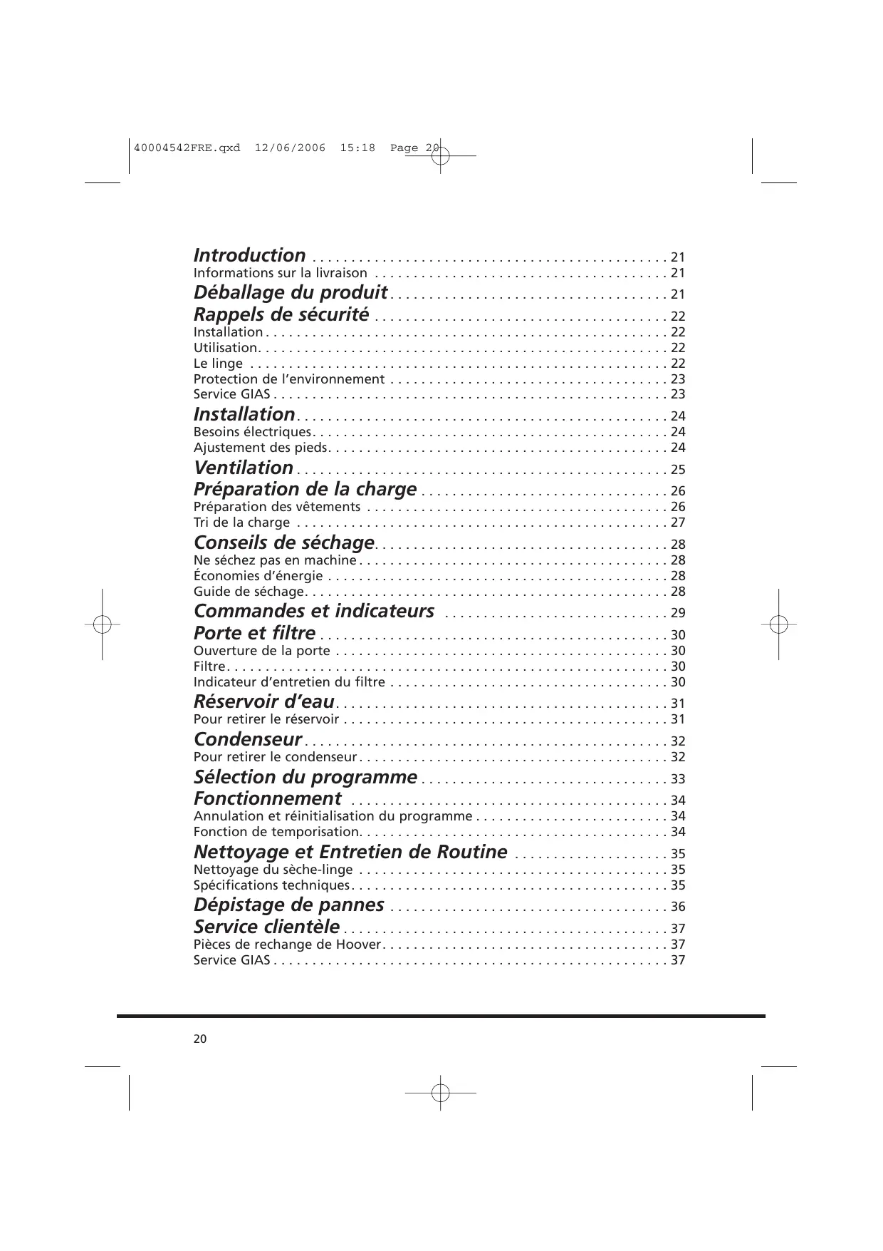 40004542FRE.qxd 12/06/2006 15:18 Page 20 Introduction . . . . . . . . . . . . . . . . . . . . . . . . . . . . . . . . . . . . . . . . . . . . . . 21 Informations sur la livraison . . . . . . . . . . . . . . . . . . . . . . . . . . . . . . . . . . . . . . 21 Déballage du produit . . . . . . . . . . . . . . . . . . . . . . . . . . . . . . . . . . . . 21 Rappels de sécurité . . . . . . . . . . . . . . . . . . . . . . . . . . . . . . . . . . . . . . 22 Installation . . . . . . . . . . . . . . . . Utilisation. . . . . . . . . . . . . . . . . Le linge . . . . . . . . . . . . . . . . . . Protection de l’environnement Service GIAS . . . . . . . . . . . . . . .