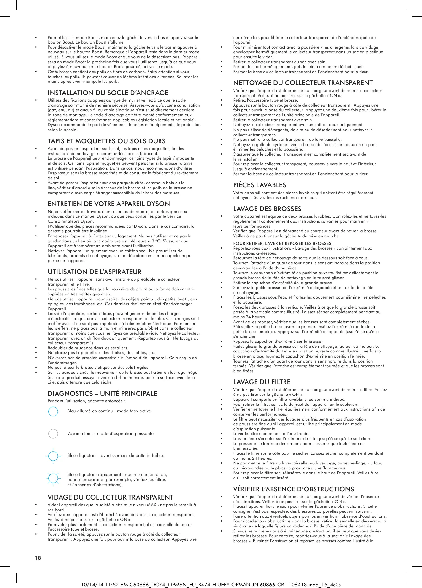 Ne pas utiliser à l’extérieur ni sur des surfaces humides, ne pas aspirer d’eau ou d’autres liquides – risque de choc électrique. Vérifier que l’appareil est en position verticale pendant son utilisation. De la poussière et des débris peuvent s’échapper de l’appareil s’il est retourné. Placer l’appareil hors tension pour vérifier l’absence d’obstructions. Destiné uniquement à l’intérieur de la maison et de la voiture. Ne pas utiliser pas l’appareil lorsque la voiture est en mouvement ou lorsque vous conduisez. 10/14/14 11:52 AM C60866_DC74_OPMAN_EU_X474-FLUFFY-OPMAN-JN 60866-CR 1106413.indd_15_4c0s