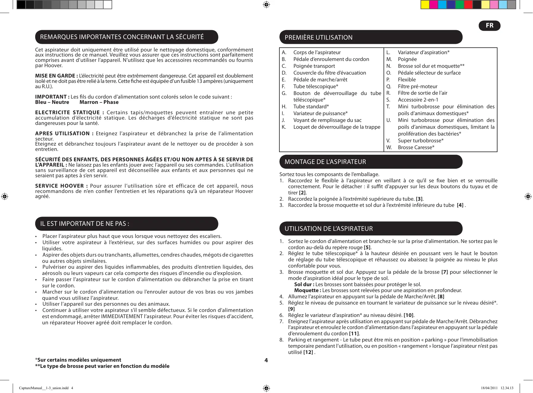 Utilisation de l’aspirateur Placer l’aspirateur plus haut que vous lorsque vous nettoyez des escaliers. Utiliser votre aspirateur à l’extérieur, sur des surfaces humides ou pour aspirer des liquides. Aspirer des objets durs ou tranchants, allumettes, cendres chaudes, mégots de cigarettes ou autres objets similaires. Pulvériser ou aspirer des liquides inflammables, des produits d’entretien liquides, des aérosols ou leurs vapeurs car cela comporte des risques d’incendie ou d’explosion. Faire passer l’aspirateur sur le cordon d’alimentation ou débrancher la prise en tirant sur le cordon. Marcher sur le cordon d’alimentation ou l’enrouler autour de vos bras ou vos jambes quand vous utilisez l’aspirateur. Utiliser l’appareil sur des personnes ou des animaux. Continuer à utiliser votre aspirateur s’il semble défectueux. Si le cordon d’alimentation est endommagé, arrêter IMMEDIATEMENT l’aspirateur. Pour éviter les risques d’accident, un réparateur Hoover agréé doit remplacer le cordon. *Sur certains modèles uniquement **Le type de brosse peut varier en fonction du modèle CaptureManual__1-3_union.indd 4
