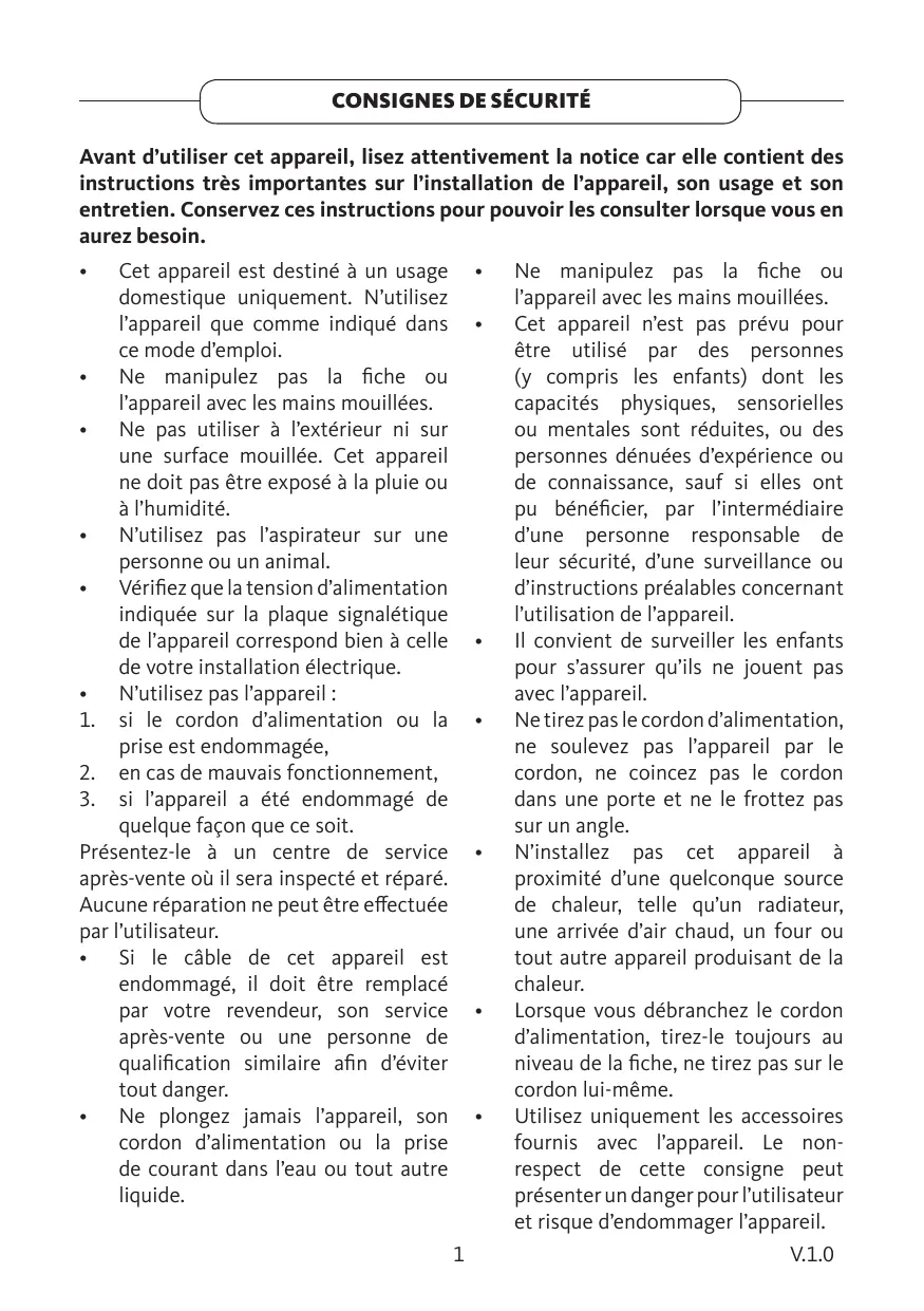 Ne manipulez pas la fiche ou l’appareil avec les mains mouillées. Cet appareil n’est pas prévu pour être utilisé par des personnes (y compris les enfants) dont les capacités physiques, sensorielles ou mentales sont réduites, ou des personnes dénuées d’expérience ou de connaissance, sauf si elles ont pu bénéficier, par l’intermédiaire d’une personne responsable de leur sécurité, d’une surveillance ou d’instructions préalables concernant l’utilisation de l’appareil. Il convient de surveiller les enfants pour s’assurer qu’ils ne jouent pas avec l’appareil. Ne tirez pas le cordon d’alimentation, ne soulevez pas l’appareil par le cordon, ne coincez pas le cordon dans une porte et ne le frottez pas sur un angle. N’installez pas cet appareil à proximité d’une quelconque source de chaleur, telle qu’un radiateur, une arrivée d’air chaud, un four ou tout autre appareil produisant de la chaleur. Lorsque vous débranchez le cordon d’alimentation, tirez-le toujours au niveau de la fiche, ne tirez pas sur le cordon lui-même. Utilisez uniquement les accessoires fournis avec l’appareil. Le nonrespect de cette consigne peut présenter un danger pour l’utilisateur et risque d’endommager l’appareil. V.1.0 ATTENTION !