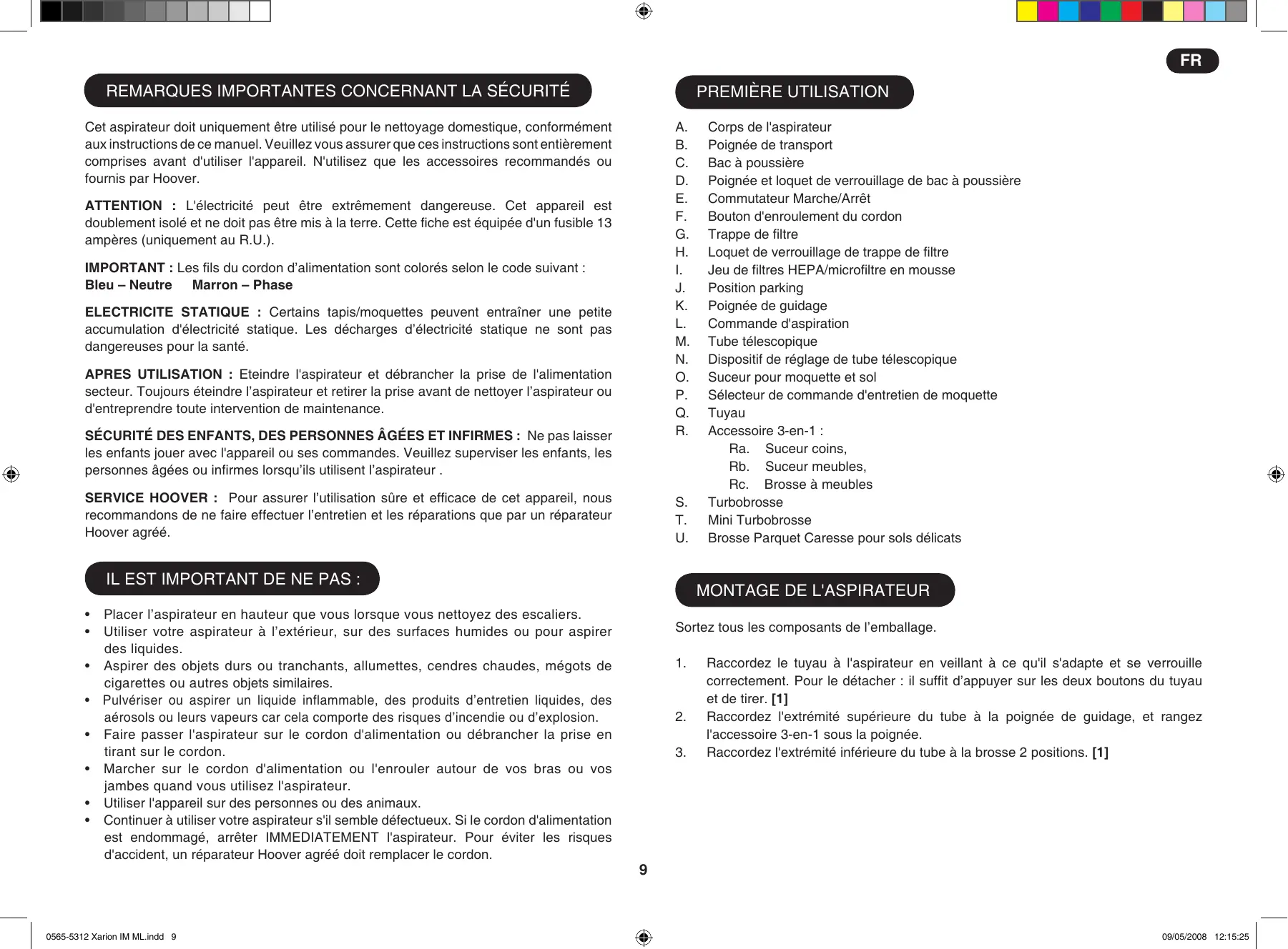 Important : Les fils du cordon d’alimentation sont colorés selon le code suivant : Bleu – Neutre Marron – Phase ELECTRICITE STATIQUE : Certains tapis/moquettes peuvent entraîner une petite accumulation d'électricité statique. Les décharges d’électricité statique ne sont pas dangereuses pour la santé. APRES UTILISATION : Eteindre l'aspirateur et débrancher la prise de l'alimentation secteur. Toujours éteindre l’aspirateur et retirer la prise avant de nettoyer l’aspirateur ou d'entreprendre toute intervention de maintenance. Sécurité des enfants, des personnes âgées et infirmes : Ne pas laisser les enfants jouer avec l'appareil ou ses commandes. Veuillez superviser les enfants, les personnes âgées ou infirmes lorsqu’ils utilisent l’aspirateur . SERVICE HOOVER : Pour assurer l’utilisation sûre et efficace de cet appareil, nous recommandons de ne faire effectuer l’entretien et les réparations que par un réparateur Hoover agréé.
