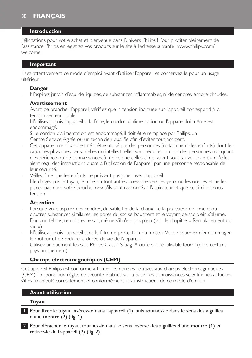 Félicitations pour votre achat et bienvenue dans l’univers Philips ! Pour profiter pleinement de l’assistance Philips, enregistrez vos produits sur le site à l’adresse suivante : www.philips.com/ welcome. Important Lisez attentivement ce mode d’emploi avant d’utiliser l’appareil et conservez-le pour un usage ultérieur. Danger -- N’aspirez jamais d’eau, de liquides, de substances inflammables, ni de cendres encore chaudes. Avertissement -- Avant de brancher l’appareil, vérifiez que la tension indiquée sur l’appareil correspond à la tension secteur locale. -- N’utilisez jamais l’appareil si la fiche, le cordon d’alimentation ou l’appareil lui-même est endommagé. -- Si le cordon d’alimentation est endommagé, il doit être remplacé par Philips, un Centre Service Agréé ou un technicien qualifié afin d’éviter tout accident. -- Cet appareil n’est pas destiné à être utilisé par des personnes (notamment des enfants) dont les capacités physiques, sensorielles ou intellectuelles sont réduites, ou par des personnes manquant d’expérience ou de connaissances, à moins que celles-ci ne soient sous surveillance ou qu’elles aient reçu des instructions quant à l’utilisation de l’appareil par une personne responsable de leur sécurité. -- Veillez à ce que les enfants ne puissent pas jouer avec l’appareil. -- Ne dirigez pas le tuyau, le tube ou tout autre accessoire vers les yeux ou les oreilles et ne les placez pas dans votre bouche lorsqu’ils sont raccordés à l’aspirateur et que celui-ci est sous tension. Attention -- Lorsque vous aspirez des cendres, du sable fin, de la chaux, de la poussière de ciment ou d’autres substances similaires, les pores du sac se bouchent et le voyant de sac plein s’allume. Dans un tel cas, remplacez le sac, même s’il n’est pas plein (voir le chapitre « Remplacement du sac »). -- N’utilisez jamais l’appareil sans le filtre de protection du moteur. Vous risqueriez d’endommager le moteur et de réduire la durée de vie de l’appareil. -- Utilisez uniquement les sacs Philips Classic S-bag ` ou le sac réutilisable fourni (dans certains pays uniquement). Champs électromagnétiques (CEM)