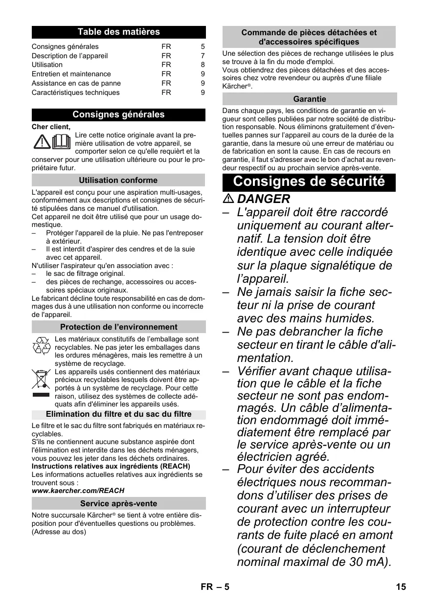 DANGER Signale la présence d'un danger imminent entraînant de graves blessures corporelles et pouvant avoir une issue mortelle. 몇 AVERTISSEMENT Signale la présence d'une situation éventuellement dangereuse pouvant entraîner de graves blessures corporelles et même avoir une issue mortelle. 몇 PRÉCAUTION Remarque relative à une situation potentiellement dangereuse pouvant entraîner des blessures légères. ATTENTION Remarque relative à une situation éventuellement dangereuse pouvant entraîner des dommages matériels. Description de l’appareil Illustrations, cf. côté escamotable ! Ces instructions de service décrivent l'aspirateur multi-usage décrit sur la page de garde. Les illustrations montrant l'équipement complet, il peut y avoir des différences au niveau de l'équipement et des accessoires livrés, suivant le modèle. Contrôler le matériel lors du déballage pour constater des accessoires manquants ou des dommages. Si des dégâts dus au transport sont constatés, il faut en informer le revendeur. Raccord du tuyau d'aspiration