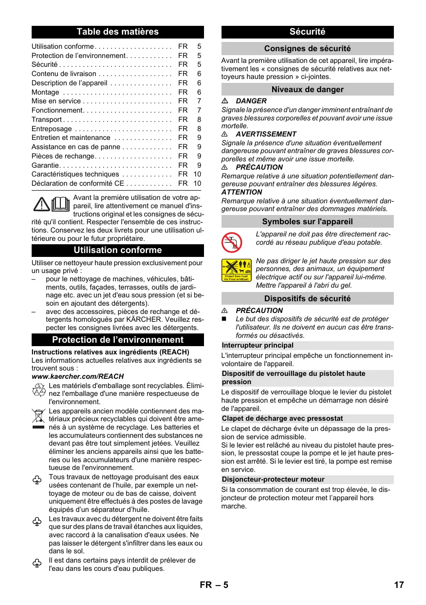 Instructions relatives aux ingrédients (REACH) Les informations actuelles relatives aux ingrédients se trouvent sous : www.kaercher.com/REACH Les matériels d'emballage sont recyclables. Éliminez l'emballage d'une manière respectueuse de l'environnement. Les appareils ancien modèle contiennent des matériaux précieux recyclables qui doivent être amenés à un système de recyclage. Les batteries et les accumulateurs contiennent des substances ne devant pas être tout simplement jetées. Veuillez éliminer les anciens appareils ainsi que les batteries ou les accumulateurs d'une manière respectueuse de l'environnement. Tous travaux de nettoyage produisant des eaux usées contenant de l’huile, par exemple un nettoyage de moteur ou de bas de caisse, doivent uniquement être effectués à des postes de lavage équipés d’un séparateur d’huile. Les travaux avec du détergent ne doivent être faits que sur des plans de travail étanches aux liquides, avec raccord à la canalisation d'eaux usées. Ne pas laisser le détergent s'infiltrer dans les eaux ou dans le sol. Il est dans certains pays interdit de prélever de l'eau dans les cours d'eau publiques.