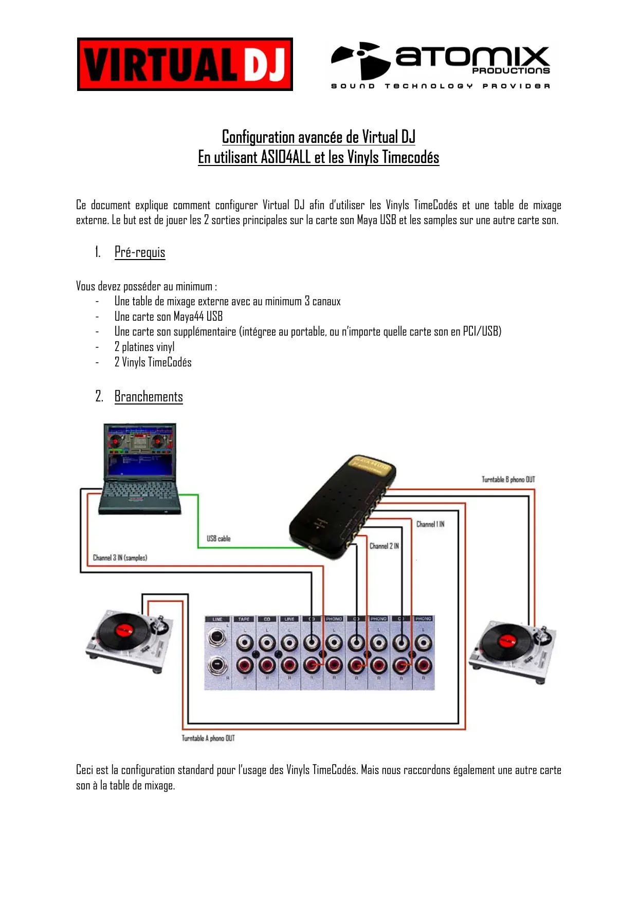 Configuration avancée de Virtual DJ En utilisant ASIO4ALL et les Vinyls Timecodés Ce document explique comment configurer Virtual DJ afin d’utiliser les Vinyls TimeCodés et une table de mixage externe. Le but est de jouer les 2 sorties principales sur la carte son Maya USB et les samples sur une autre carte son.