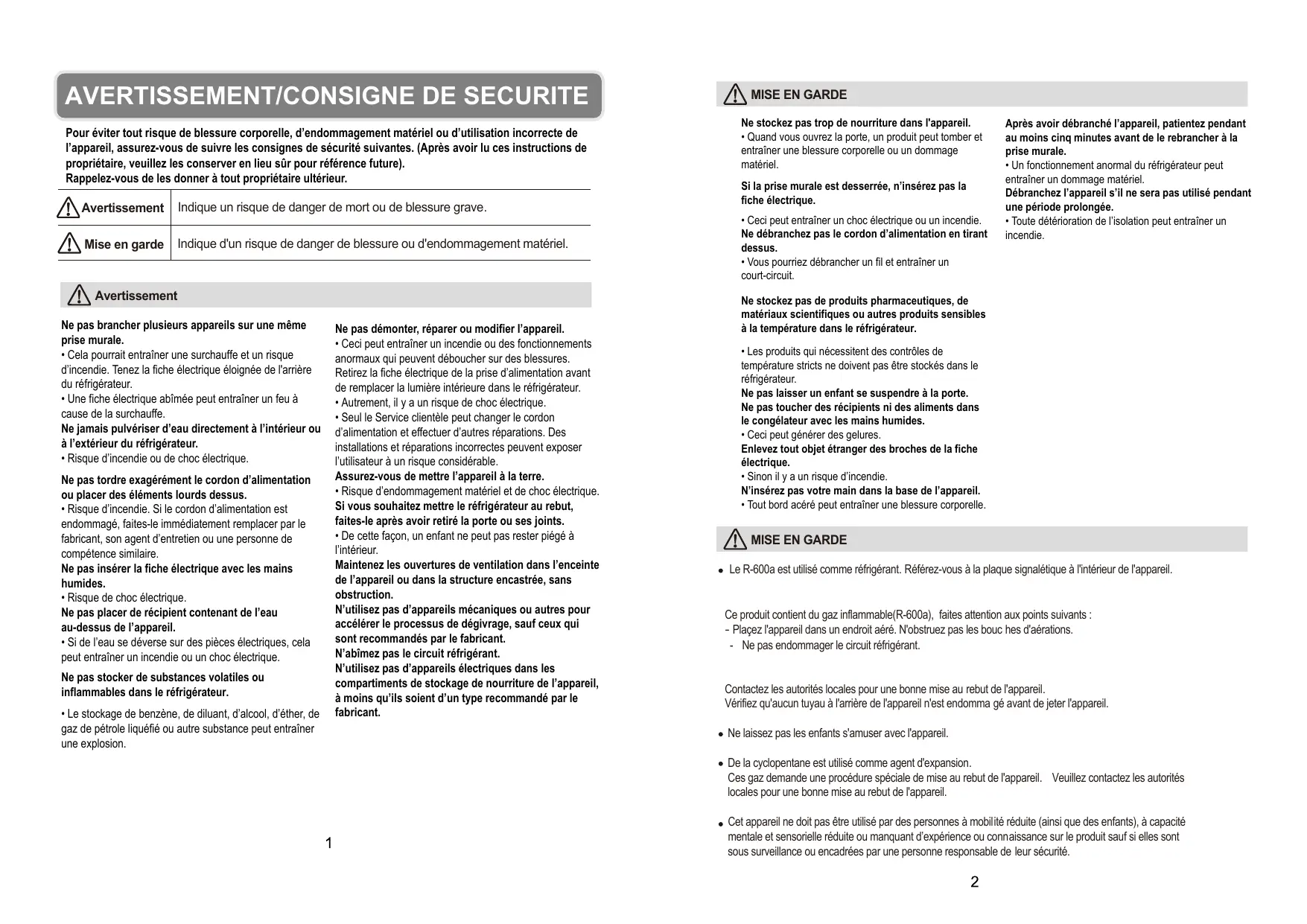Le R-600a est utilisé comme réfrigérant. Référez-vous à la plaque signalétique à l'intérieur de l'appareil. Ce produit contient du gaz inflammable(R-600a), faites attention aux points suivants : - Plaçez l'appareil dans un endroit aéré. N'obstruez pas les bouc hes d'aérations. - Ne pas endommager le circuit réfrigérant. Contactez les autorités locales pour une bonne mise au rebut de l'appareil. Vérifiez qu'aucun tuyau à l'arrière de l'appareil n'est endomma gé avant de jeter l'appareil. Ne laissez pas les enfants s'amuser avec l'appareil. De la cyclopentane est utilisé comme agent d'expansion. Ces gaz demande une procédure spéciale de mise au rebut de l'appareil. Veuillez contactez les autorités locales pour une bonne mise au rebut de l'appareil. Cet appareil ne doit pas être utilisé par des personnes à mobilité réduite (ainsi que des enfants), à capacité mentale et sensorielle réduite ou manquant d’expérience ou connaissance sur le produit sauf si elles sont sous surveillance ou encadrées par une personne responsable de leur sécurité.