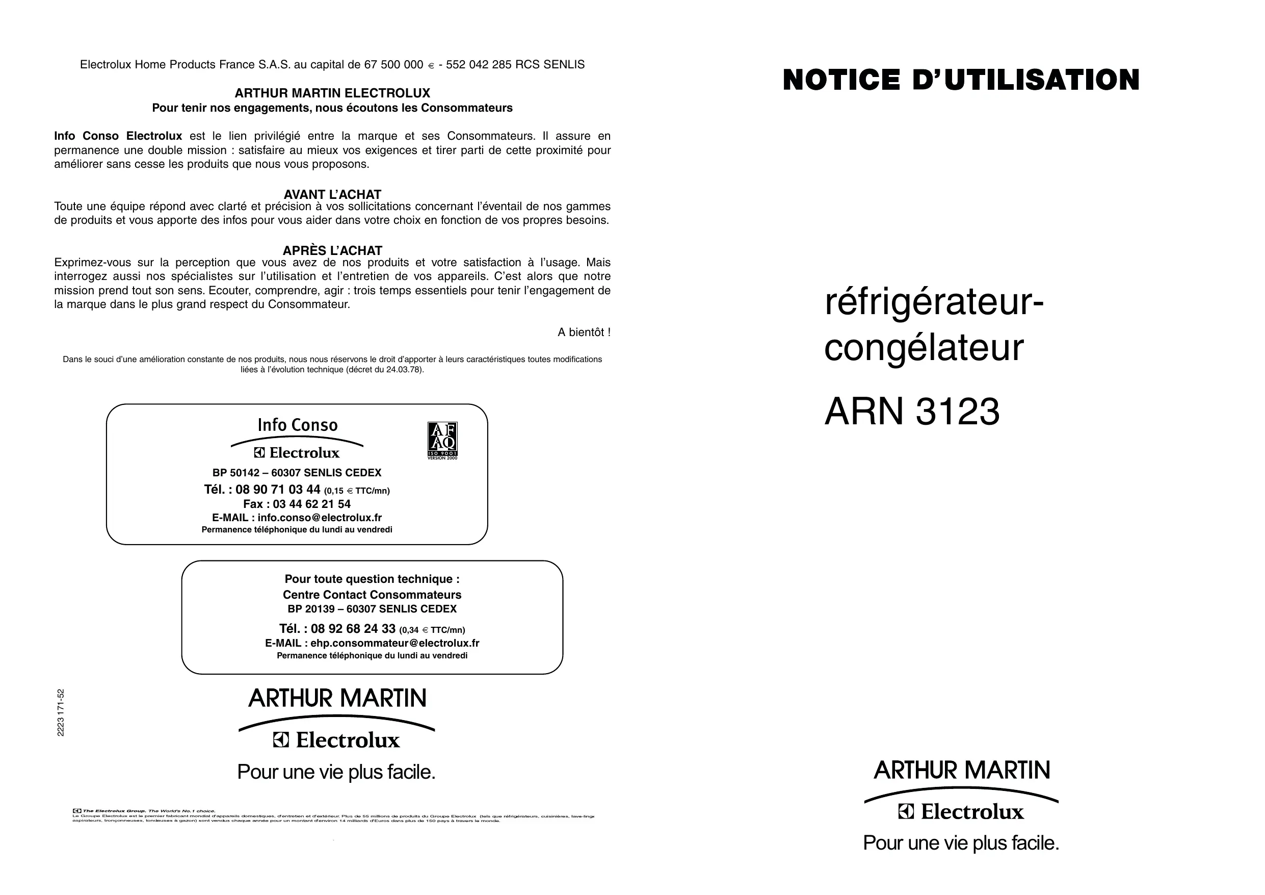 Retrouvez gratuitement la notice de l'appareil ARA 2823 ARTHUR MARTIN au format PDF.