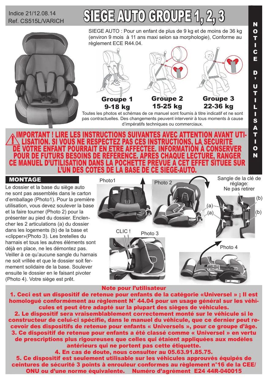SIEGE AUTO : Pour un enfant de plus de 9 kg et de moins de 36 kg (environ 9 mois à 11 ans maxi selon sa morphologie), Conforme au règlement ECE R44.04. Groupe 1 9-18 kg Groupe 2 15-25 kg Groupe 3 22-36 kg Toutes les photos et schémas de ce manuel sont fournis à titre indicatif et ne sont pas contractuelles. Des changements peuvent intervenir à tous moments à cause d’impératifs techniques ou commerciaux. IMPORTANT ! LIRE LES INSTRUCTIONS SUIVANTES AVEC ATTENTION AVANT UTILISATION. SI VOUS NE RESPECTEZ PAS CES INSTRUCTIONS, LA SECURITE DE VOTRE ENFANT POURRAIT EN ETRE AFFECTEE. INFORMATION À CONSERVER POUR DE FUTURS BESOINS DE RÉFÉRENCE. APRES CHAQUE LECTURE, RANGER CE MANUEL D’UTILISATION DANS LA POCHETTE PREVUE A CET EFFET SITUEE SUR L’UN DES COTES DE LA BASE DE CE SIEGE-AUTO. MONTAGE Le dossier et la base du siège auto ne sont pas assemblés dans le carton d’emballage (Photo1). Pour la première utilisation, vous devez soulever la base et la faire tourner (Photo 2) pour la présenter au pied du dossier. Enclencher les 2 articulations (a) du dossier dans les logements (b) de la base et «clipper»(Photo 3). Les bretelles du harnais et tous les autres éléments sont déjà en place, ne les démontez pas. Veiller à ce qu’aucune sangle du harnais ne soit vrillée et que le dossier soit fermement solidaire de la base. Soulever ensuite le dossier en le faisant pivoter (Photo 4). Votre siège est prêt. Photo1 P.1