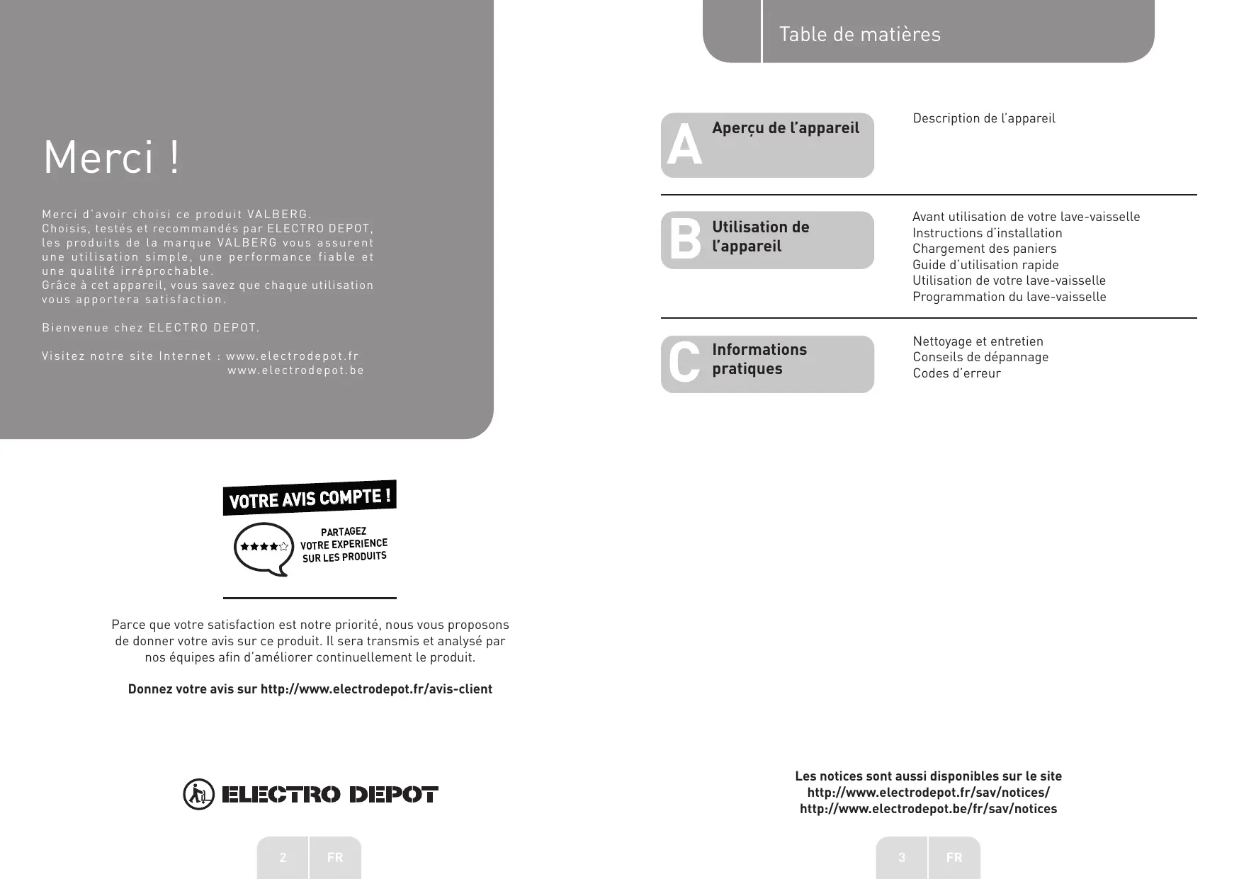 Informations pratiques Nettoyage et entretien Conseils de dépannage Codes d’erreur Parce que votre satisfaction est notre priorité, nous vous proposons de donner votre avis sur ce produit. Il sera transmis et analysé par nos équipes afin d’améliorer continuellement le produit. Donnez votre avis sur http://www.electrodepot.fr/avis-client Les notices sont aussi disponibles sur le site http://www.electrodepot.fr/sav/notices/ http://www.electrodepot.be/fr/sav/notices
