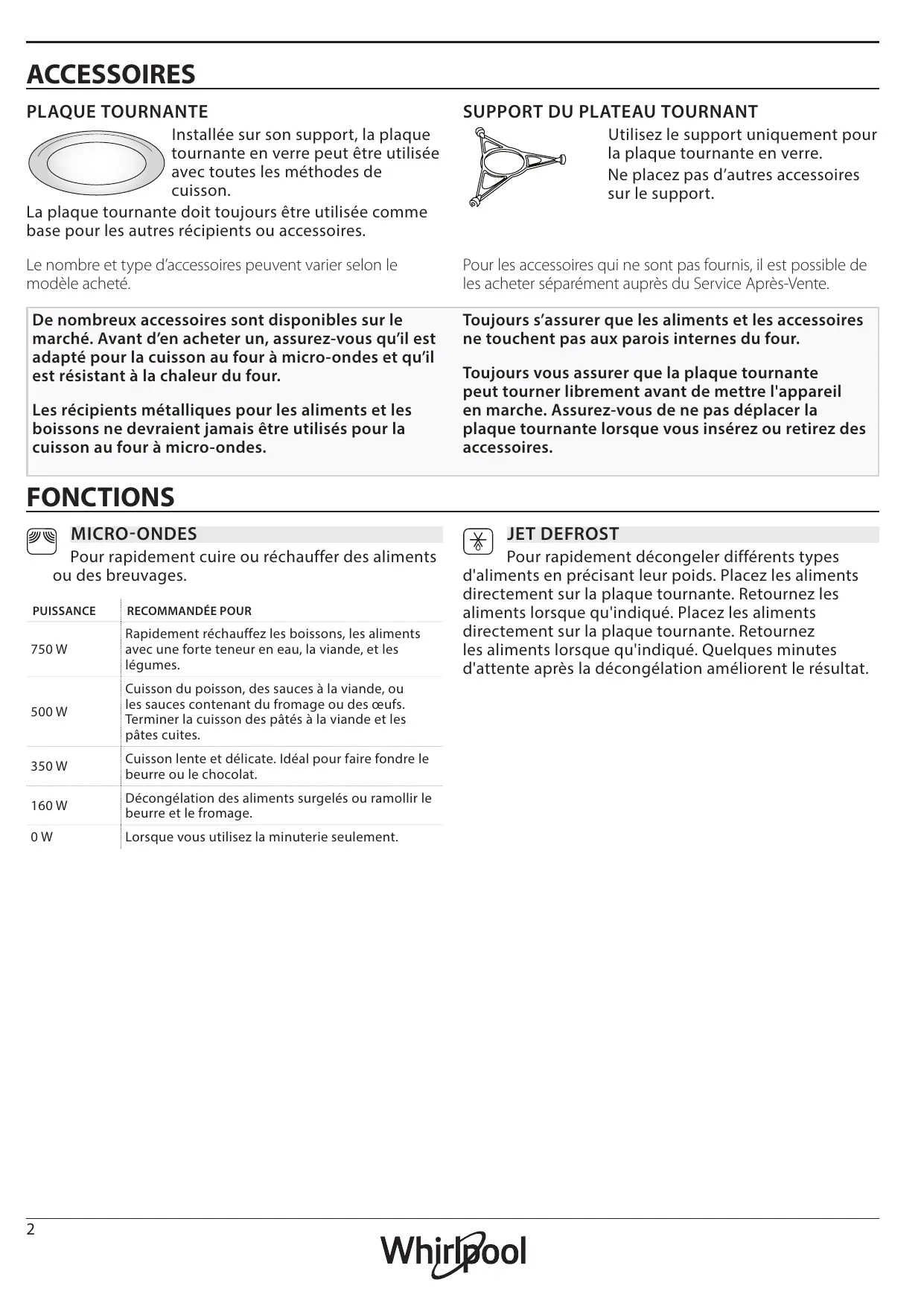 Utilisez le support uniquement pour la plaque tournante en verre. Ne placez pas d’autres accessoires sur le support. Pour les accessoires qui ne sont pas fournis, il est possible de les acheter séparément auprès du Service Après-Vente. Toujours s’assurer que les aliments et les accessoires ne touchent pas aux parois internes du four. Toujours vous assurer que la plaque tournante peut tourner librement avant de mettre l'appareil en marche. Assurez-vous de ne pas déplacer la plaque tournante lorsque vous insérez ou retirez des accessoires. FONCTIONS MICRO-ONDES Pour rapidement cuire ou réchauffer des aliments ou des breuvages. PUISSANCE