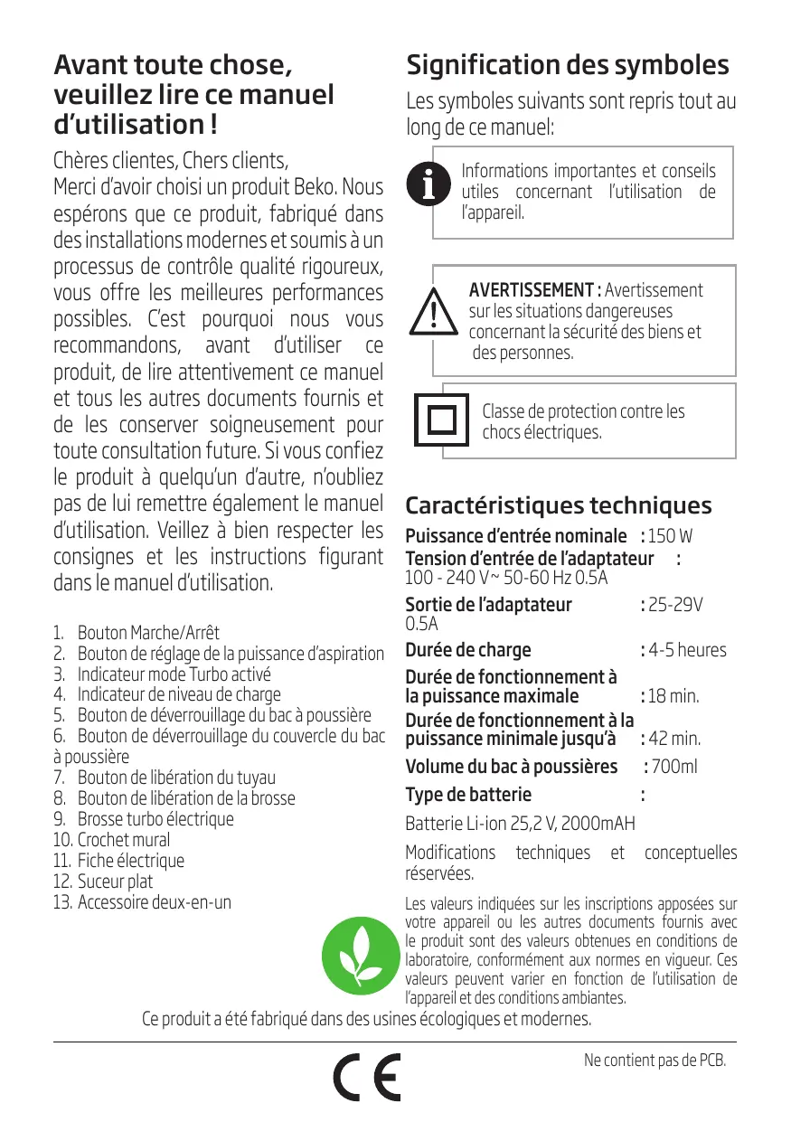 Chères clientes, Chers clients, Merci d’avoir choisi un produit Beko. Nous espérons que ce produit, fabriqué dans des installations modernes et soumis à un processus de contrôle qualité rigoureux, vous offre les meilleures performances possibles. C’est pourquoi nous vous recommandons, avant d’utiliser ce produit, de lire attentivement ce manuel et tous les autres documents fournis et de les conserver soigneusement pour toute consultation future. Si vous confiez le produit à quelqu’un d’autre, n’oubliez pas de lui remettre également le manuel d’utilisation. Veillez à bien respecter les consignes et les instructions figurant dans le manuel d’utilisation. 1. Bouton Marche/Arrêt 2. Bouton de réglage de la puissance d’aspiration 3. Indicateur mode Turbo activé 4. Indicateur de niveau de charge 5. Bouton de déverrouillage du bac à poussière 6. Bouton de déverrouillage du couvercle du bac à poussière 7. Bouton de libération du tuyau 8. Bouton de libération de la brosse 9. Brosse turbo électrique 10. Crochet mural 11. Fiche électrique 12. Suceur plat 13. Accessoire deux-en-un