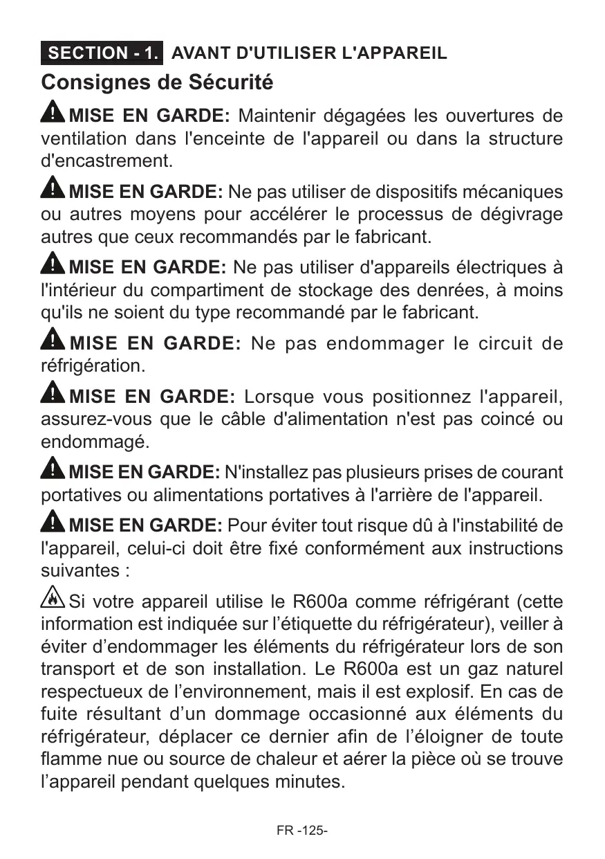 Consignes de Sécurité MISE EN GARDE: Maintenir dégagées les ouvertures de ventilation dans l'enceinte de l'appareil ou dans la structure d'encastrement. MISE EN GARDE: Ne pas utiliser de dispositifs mécaniques ou autres moyens pour accélérer le processus de dégivrage autres que ceux recommandés par le fabricant. MISE EN GARDE: Ne pas utiliser d'appareils électriques à l'intérieur du compartiment de stockage des denrées, à moins qu'ils ne soient du type recommandé par le fabricant. MISE EN GARDE: Ne pas endommager le circuit de réfrigération. MISE EN GARDE: Lorsque vous positionnez l'appareil, assurez-vous que le câble d'alimentation n'est pas coincé ou endommagé. MISE EN GARDE: N'installez pas plusieurs prises de courant portatives ou alimentations portatives à l'arrière de l'appareil. MISE EN GARDE: Pour éviter tout risque dû à l'instabilité de l'appareil, celui-ci doit être fixé conformément aux instructions suivantes : Si votre appareil utilise le R600a comme réfrigérant (cette information est indiquée sur l’étiquette du réfrigérateur), veiller à éviter d’endommager les éléments du réfrigérateur lors de son transport et de son installation. Le R600a est un gaz naturel respectueux de l’environnement, mais il est explosif. En cas de fuite résultant d’un dommage occasionné aux éléments du réfrigérateur, déplacer ce dernier afin de l’éloigner de toute flamme nue ou source de chaleur et aérer la pièce où se trouve l’appareil pendant quelques minutes. FR -125-