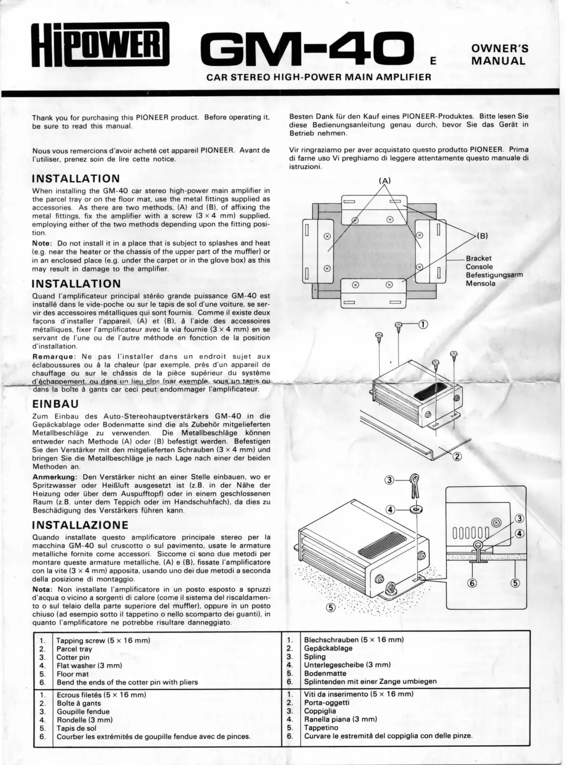 Quand l'amplificateur principal stéreo grande puissance GM-40 est installé dans le vide-poche ou sur le tapis de sol d'une voiture, se servir des accessoires métalliques qui sont fournis. comme il existe deux façons d'installer l'appareil, (A) et (B), à l'aide des accessoires métalliques, fixer l'amplificateur avec la via fournie (3× 4mm) en se servant de l'une ou de l'autre méthode en fonction de la position d'installation.
