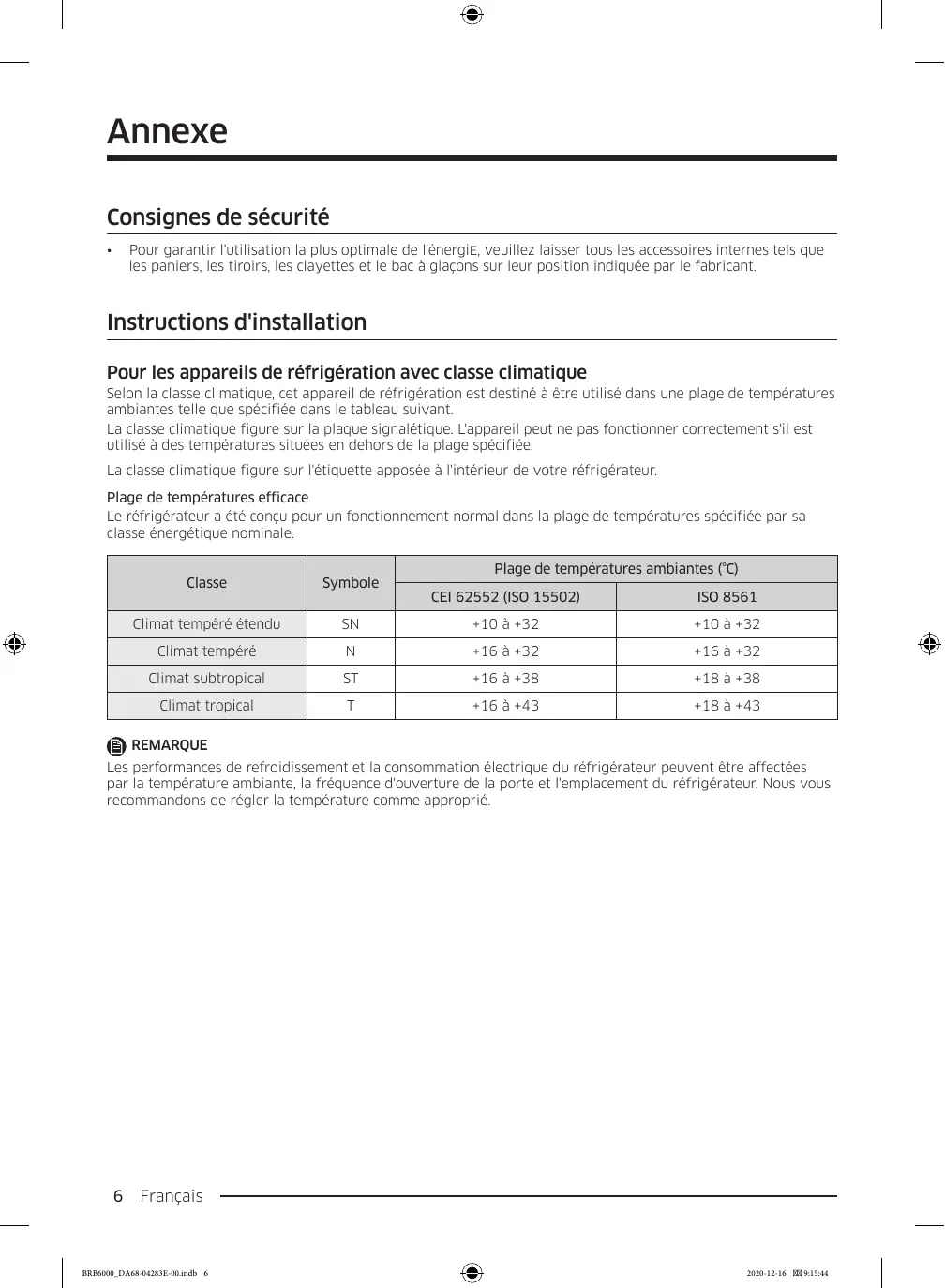 Français BRB6000_DA68-04283E-00.indb 6 2020-12-16 9:15:44 Consignes relatives à la température Température recommandée Réglage de température optimal pour le stockage d'aliments :