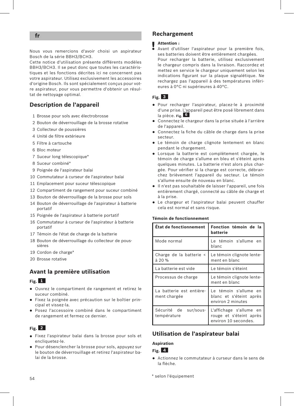 Niveau de puissance 2 Aspiration avec une brosse électrique activée. Pour des tâches de nettoyage difficiles sur toutes les surfaces (surtout sur les tapis). L'appareil atteint une durée de marche plus courte dans ce réglage. Durée de marche Comme toutes les batteries au Lithium-Ion, la batterie peut s'user naturellement. Avec le temps, la capacité de la batterie diminue, ainsi que sa durée de marche. Il s'agit là d'un processus de vieillissement naturel qui ne vient pas d'un défaut de matériaux ou de fabrication, ni d'un vice. BBH3/BCH3 25,2V BBH3/BCH3 21,6V En mode normal avec une brosse pour sols pour des tâches de nettoyage normales Jusqu'à 55 min. Jusqu'à 50 min. En mode turbo avec embout électrique pour plancher ou aspirateur manuel sur piles pour des tâches de nettoyage complexes. Jusqu'à 20 min. Pour aspirer à des endroits difficiles d'accès et audessus de la tête. Ouvrez l'emplacement de l'accessoire via la poignée encastrée, retirez le suceur long, placez-le sur le trou d'aspiration de l'aspirateur à batterie portatif et encliquetez-le. Le suceur long peut être étendu si nécessaire. Pour ce faire, appuyez sur le bouton de déverrouillage, étirez le suceur long et encliquetez-le à sa position finale. Après utilisation, repliez si nécessaire le suceur long, placez-le dans l'emplacement pour accessoires et fermez ce dernier.