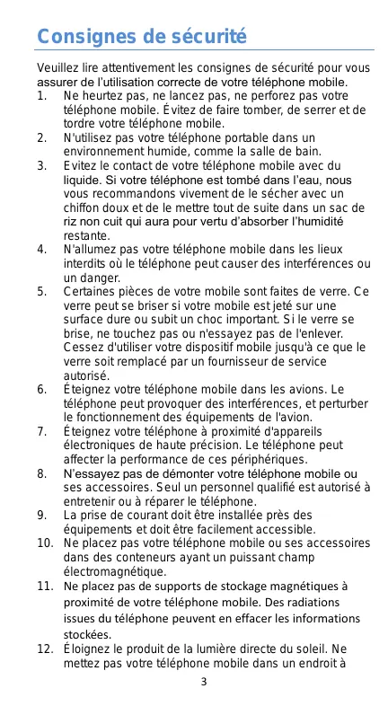 Consignes de sécurité 3 Dispositif médical 4 Chargement de la batterie 12 Opérations de base 13 Allumer/éteindre votre périphérique 13 Configurez votre téléphone au démarrage 13 Déverrouiller l'écran 15 Présentation de l'écran 15 Panneau de notifications 16 Ouverture du panneau des notifications 17 Personnalisez votre écran 18 Réseaux 19 Fonction principale 19 Lancer et recevoir un appel 19 Ajout de contacts 20 Envoi de message 21 Musique 22 Caméra 22 Gestes fonctionnels 24 1. Ne heurtez pas, ne lancez pas, ne perforez pas votre téléphone mobile. Évitez de faire tomber, de serrer et de tordre votre téléphone mobile. 2. N'utilisez pas votre téléphone portable dans un environnement humide, comme la salle de bain. 3. Evitez le contact de votre téléphone mobile avec du liquide. Si votre téléphone est tombé dans l’eau, nous vous recommandons vivement de le sécher avec un chiffon doux et de le mettre tout de suite dans un sac de riz non cuit qui aura pour vertu d’absorber l’humidité restante. 4. N'allumez pas votre téléphone mobile dans les lieux interdits où le téléphone peut causer des interférences ou un danger. 5. Certaines pièces de votre mobile sont faites de verre. Ce verre peut se briser si votre mobile est jeté sur une surface dure ou subit un choc important. Si le verre se brise, ne touchez pas ou n'essayez pas de l'enlever. Cessez d'utiliser votre dispositif mobile jusqu'à ce que le verre soit remplacé par un fournisseur de service autorisé. 6. Éteignez votre téléphone mobile dans les avions. Le téléphone peut provoquer des interférences, et perturber le fonctionnement des équipements de l'avion. 7. Éteignez votre téléphone à proximité d'appareils électroniques de haute précision. Le téléphone peut affecter la performance de ces périphériques. 8. N’essayez pas de démonter votre téléphone mobile ou ses accessoires. Seul un personnel qualifié est autorisé à entretenir ou à réparer le téléphone. 9. La prise de courant doit être installée près des équipements et doit être facilement accessible. 10. Ne placez pas votre téléphone mobile ou ses accessoires dans des conteneurs ayant un puissant champ électromagnétique. 11. Ne placez pas de supports de stockage magnétiques à