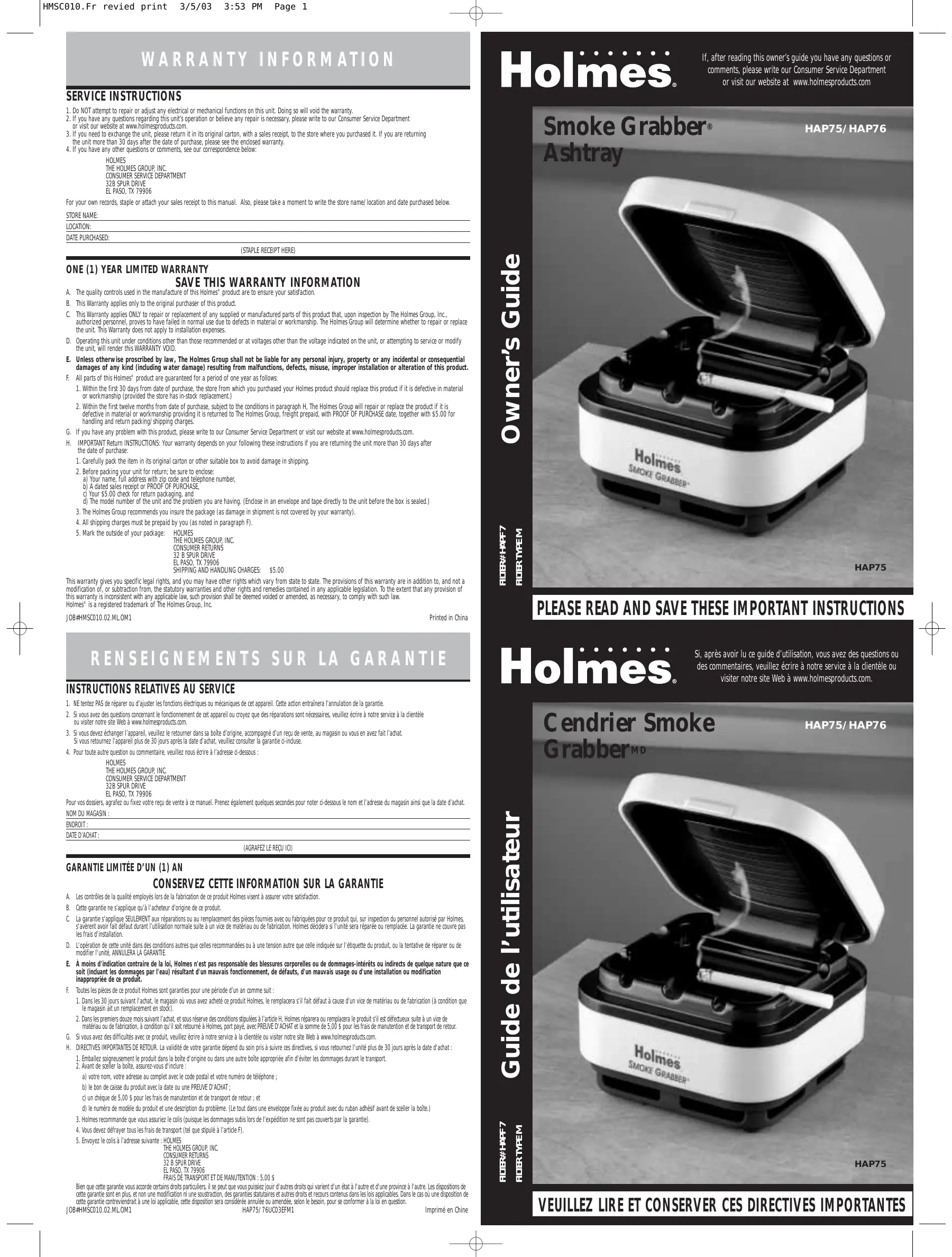 (STAPLE RECEIPT HERE) Owner’s Guide STORE NAME: LOCATION: DATE PURCHASED: HAP75 PLEASE READ AND SAVE THESE IMPORTANT INSTRUCTIONS Printed in China Si, après avoir lu ce guide d’utilisation, vous avez des questions ou des commentaires, veuillez écrire à notre service à la clientèle ou visiter notre site Web à www.holmesproducts.com.