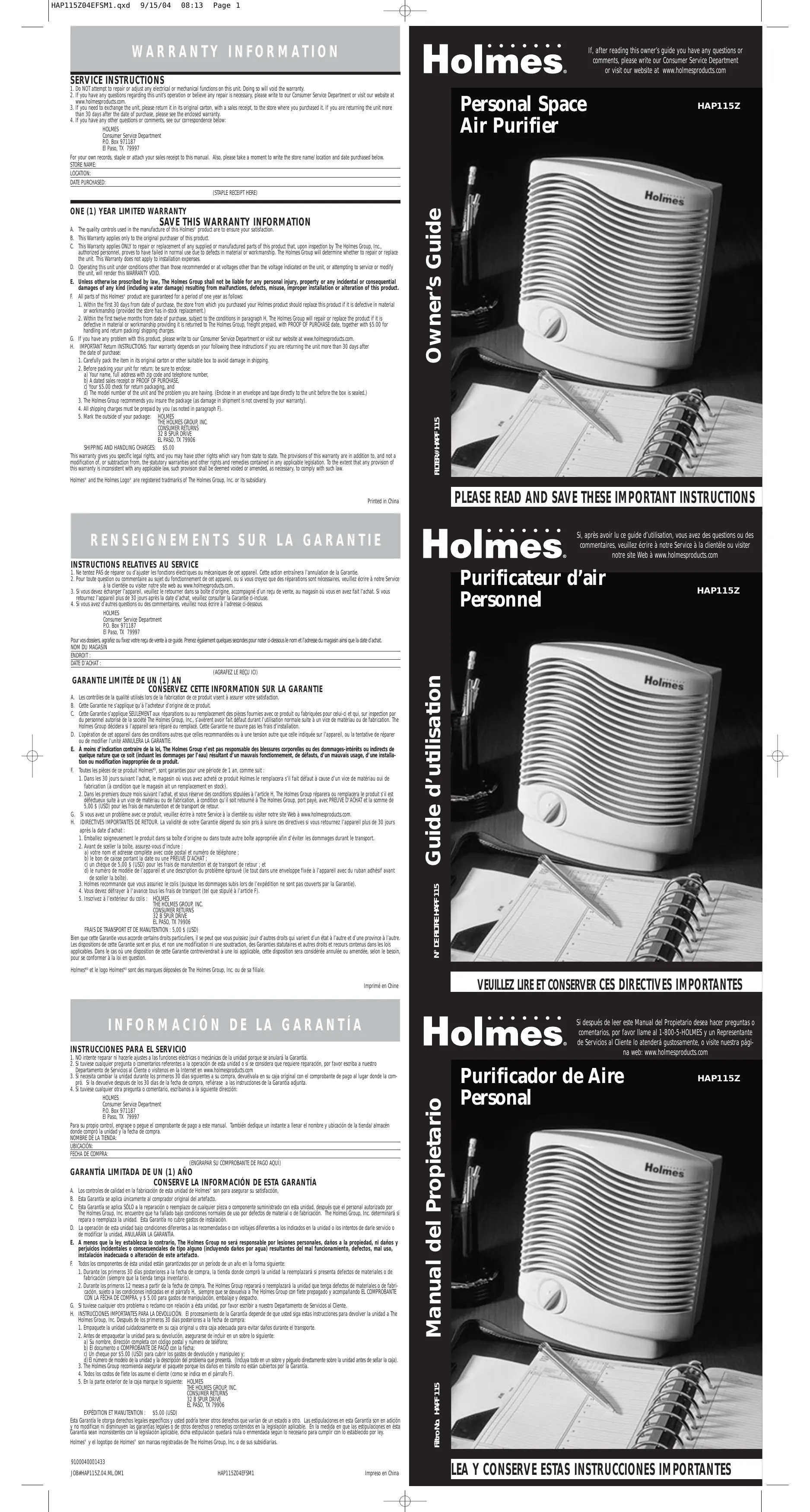 Owner’s Guide (STAPLE RECEIPT HERE) Holmes® and the Holmes Logo® are registered tradmarks of The Holmes Group, Inc. or its subsidiary. PLEASE READ AND SAVE THESE IMPORTANT INSTRUCTIONS Printed in China Si, après avoir lu ce guide d’utilisation, vous avez des questions ou des commentaires, veuillez écrire à notre Service à la clientèle ou visiter notre site Web à www.holmesproducts.com