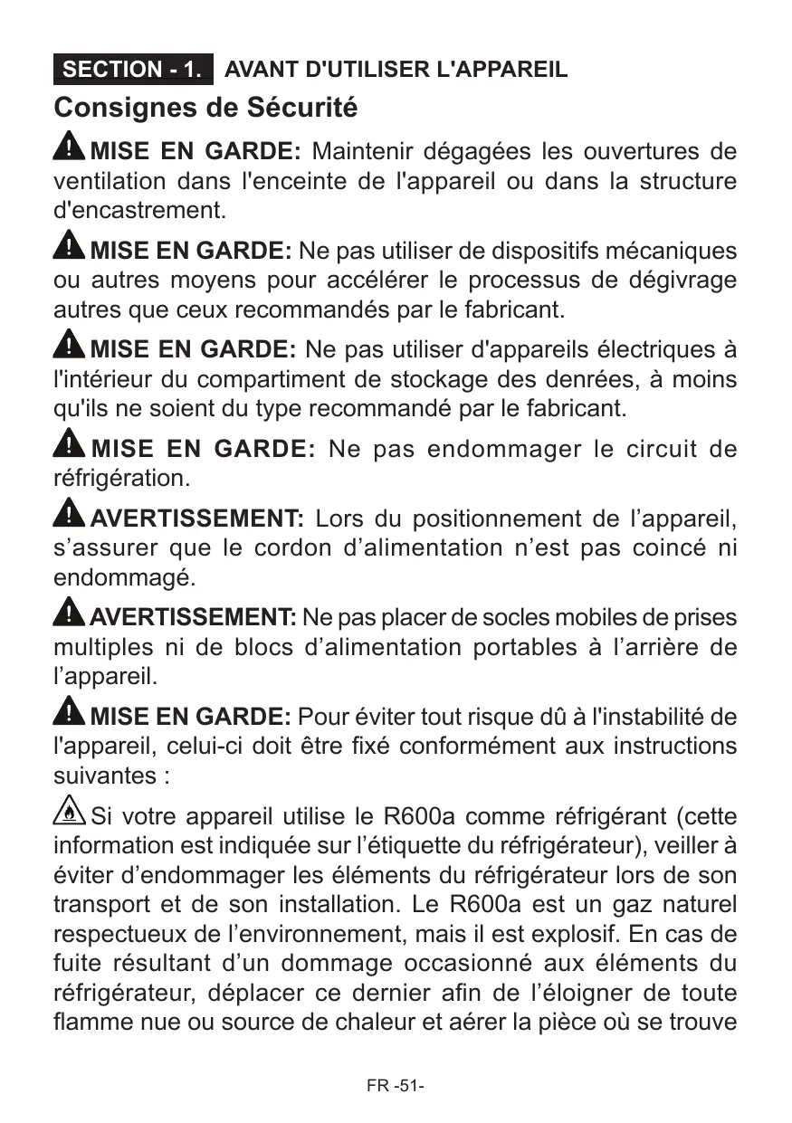 multiples ni de blocs d’alimentation portables à l’arrière de l’appareil. MISE EN GARDE: Pour éviter tout risque dû à l'instabilité de l'appareil, celui-ci doit être fixé conformément aux instructions suivantes : Si votre appareil utilise le R600a comme réfrigérant (cette information est indiquée sur l’étiquette du réfrigérateur), veiller à éviter d’endommager les éléments du réfrigérateur lors de son transport et de son installation. Le R600a est un gaz naturel respectueux de l’environnement, mais il est explosif. En cas de fuite résultant d’un dommage occasionné aux éléments du réfrigérateur, déplacer ce dernier afin de l’éloigner de toute flamme nue ou source de chaleur et aérer la pièce où se trouve FR -51- l’appareil pendant quelques minutes.
