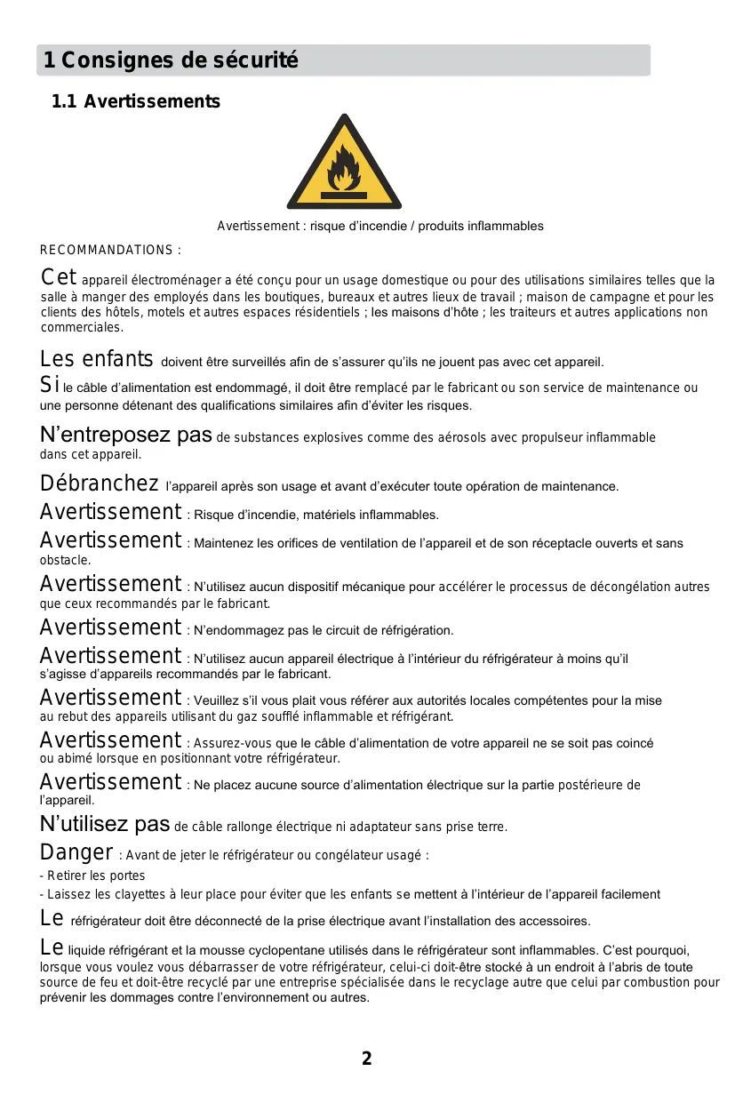 Ne mettez pas de produits inflammables, explosifs, volatils ou hautement corrosifs dans le réfrigérateur afin d’éviter d’endommager l’appareil ou de créer un incendie. Ne mettez pas de produits inflammables près du réfrigérateur pour éviter tout risque d’incendie.