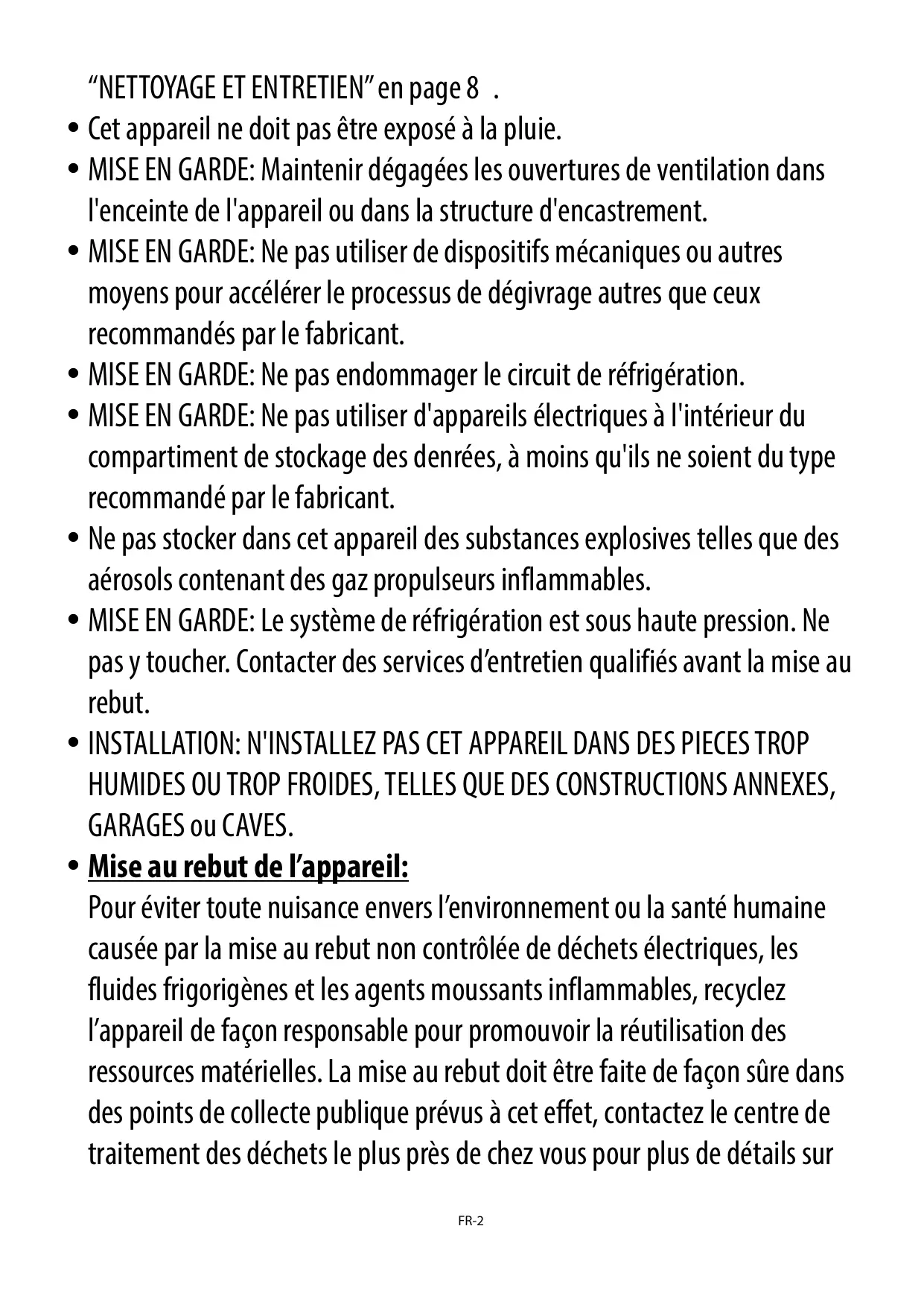 Cet appareil ne doit pas être exposé à la pluie. MISE EN GARDE: Maintenir dégagées les ouvertures de ventilation dans l'enceinte de l'appareil ou dans la structure d'encastrement. MISE EN GARDE: Ne pas utiliser de dispositifs mécaniques ou autres moyens pour accélérer le processus de dégivrage autres que ceux recommandés par le fabricant. MISE EN GARDE: Ne pas endommager le circuit de réfrigération. MISE EN GARDE: Ne pas utiliser d'appareils électriques à l'intérieur du compartiment de stockage des denrées, à moins qu'ils ne soient du type recommandé par le fabricant. Ne pas stocker dans cet appareil des substances explosives telles que des aérosols contenant des gaz propulseurs inflammables. MISE EN GARDE: Le système de réfrigération est sous haute pression. Ne pas y toucher. Contacter des services d’entretien qualifiés avant la mise au rebut. INSTALLATION: N'INSTALLEZ PAS CET APPAREIL DANS DES PIECES TROP HUMIDES OU TROP FROIDES, TELLES QUE DES CONSTRUCTIONS ANNEXES, GARAGES ou CAVES. Mise au rebut de l’appareil: Pour éviter toute nuisance envers l’environnement ou la santé humaine causée par la mise au rebut non contrôlée de déchets électriques, les fluides frigorigènes et les agents moussants inflammables, recyclez l’appareil de façon responsable pour promouvoir la réutilisation des ressources matérielles. La mise au rebut doit être faite de façon sûre dans des points de collecte publique prévus à cet effet, contactez le centre de traitement des déchets le plus près de chez vous pour plus de détails sur FR-2