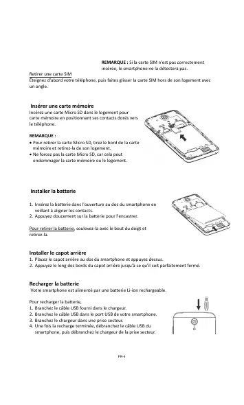 Insérer une carte mémoire Insérez une carte Micro SD dans le logement pour carte mémoire en positionnant ses contacts dorés vers le téléphone. REMARQUE : x Pour retirer la carte Micro SD, tirez le bord de la carte mémoire et retirez-la de son logement. x Ne forcez pas la carte Micro SD, car cela peut endommager la carte mémoire ou le logement.