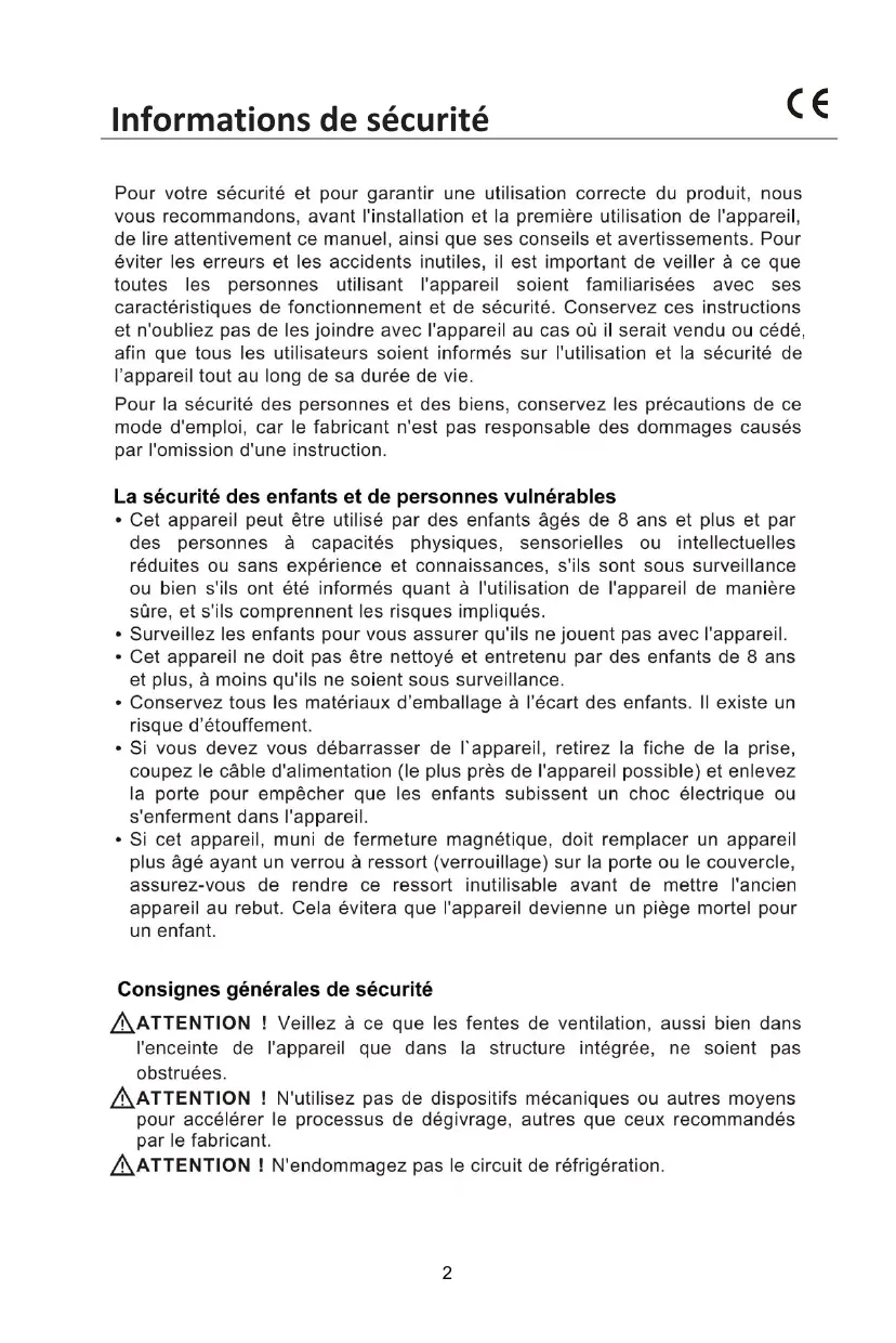 Ne laissez pas d’aliments frais, non congelés, toucher des aliments déjà congelés pour éviter une élévation de température de ce dernier. Les aliments maigres se conservent mieux et plus longtemps que les aliments gras. Le sel réduit la durée de conservation des denrées alimentaires. Les sorbets, s’ils sont consommés immédiatement après le retrait du compartiment de congélateur, peuvent éventuellement causer des brûlures de la peau par le froid. Il est conseillé de présenter la date de congélation sur chaque emballage individuel pour mieux gérer les dates de péremption. Conseils pour la conservation des aliments congelés Pour obtenir les meilleures performances de cet appareil, vous devez : Assurez-vous que les produits alimentaires surgelés dans le commerce n’aient pas quittés la chaine de refroidissement. Assurez-vous que les produits alimentaires congelés sont transportés entre le magasin et votre congélateur dans les délais les plus courts. N’ouvrez pas la porte trop fréquemment et ne la laissez pas ouverte plus longtemps que nécessaire. Une fois décongelés, les aliments se détériorent rapidement et ne peuvent pas être recongelés. Ne dépassez pas la durée de conservation indiquée par le fabricant des produits alimentaires Conseils pour la réfrigération Conseils utiles : Tous types d’aliments : enveloppez les aliments dans des sachets de congélation et placez-les sur les clayettes en verre au-dessus du bac à légumes. Pour votre sécurité, il est recommandé de ne pas conserver les aliments plus de deux jours de cette façon. Les aliments cuits, plats, froids, etc. : ceux-ci devraient être couverts et peuvent être placés sur n’importe quelle clayette. Fruits et légumes : ceux-ci doivent être soigneusement nettoyés et places dans le (les) bac(s) fourni(s). Beurre et fromage : ceux-ci doivent être places dans des récipients étanches spéciaux ou enveloppés dans une feuille d’aluminium ou des sacs en polyéthylène pour les rendre le plus étanche à l’air que possible. Bouteilles de lait : celles-ci doivent être pourvues d’un capuchon et doivent être stockées sur les balconnets dans la porte. Conseils pour la réfrigération des aliments frais Pour obtenir les meilleures performances : Ne conservez pas les aliments chauds ou liquides en évaporation dans le réfrigérateur. Couvrez ou enveloppez la denrée, en particulier si elle a une forte odeur. Nettoyage Pour des raisons d’hygiène, l’intérieur de l’appareil, y compris les accessoires intérieurs, doivent être nettoyés régulièrement.