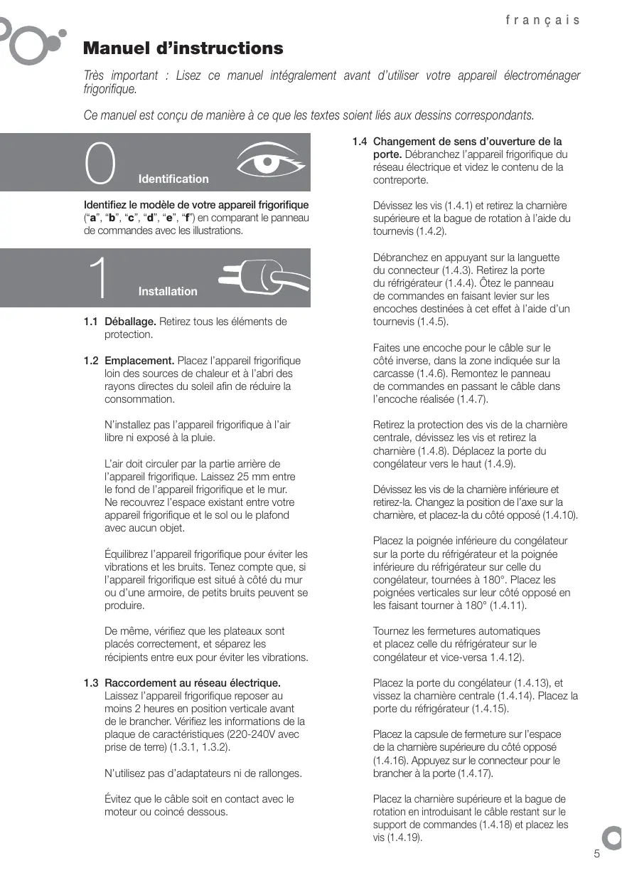 1.4 Changement de sens d’ouverture de la porte. Débranchez l’appareil frigorifique du réseau électrique et videz le contenu de la contreporte.