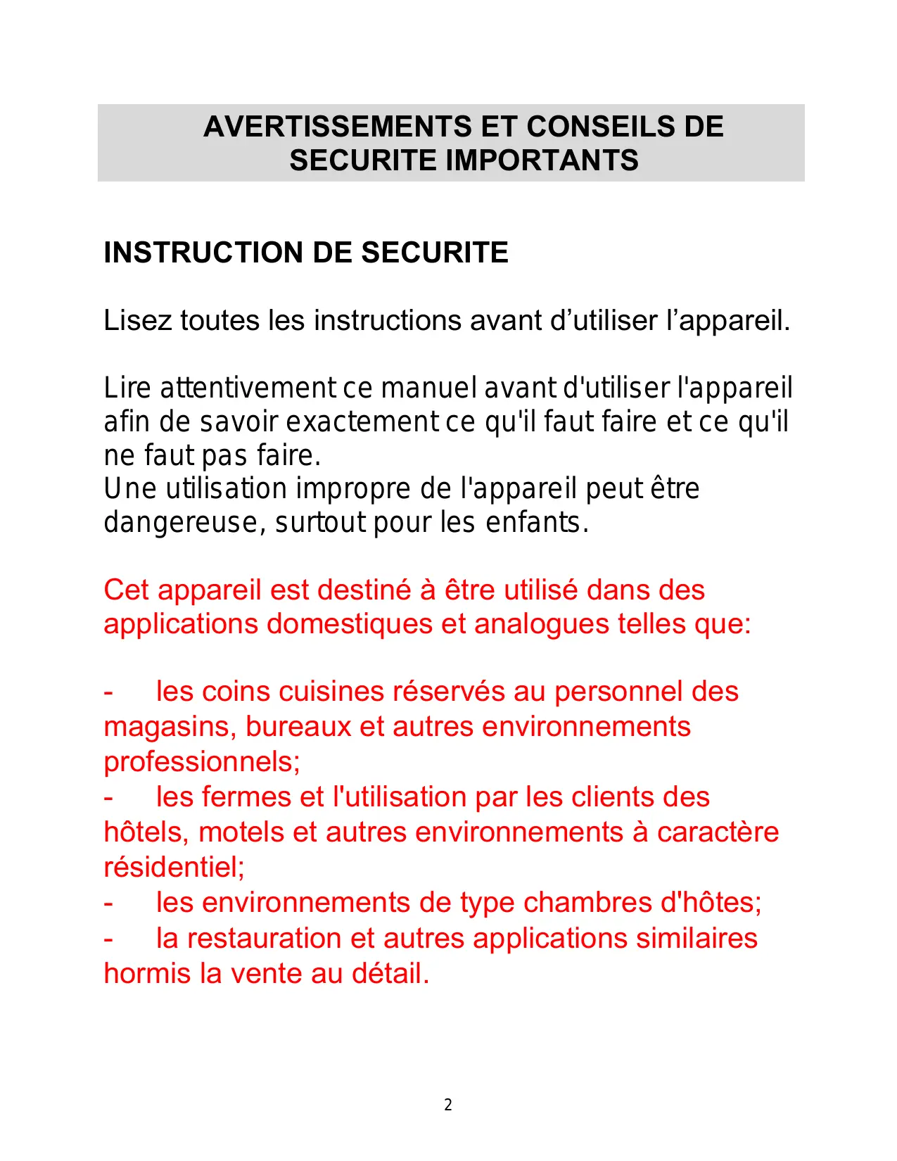 AVERTISSEMENTS ET CONSEILS DE SECURITE IMPORTANTS 2