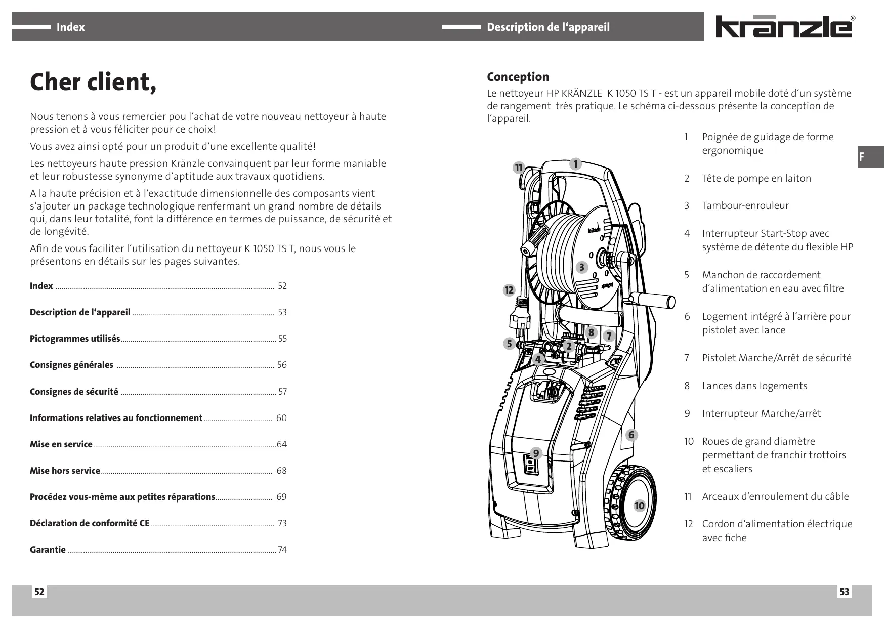 Inhaltsverzeichnis 84 dB (A) 87 dB (A) Anhang V, Lärmrichtlinie 2005/88/EG EN 60 335-2-79 :2009 EN 55 014-1 :2006 EN 61 000-3-2 :2006 EN 61 000-3-3 :2008 Cher client, Nous tenons à vous remercier pou l‘achat de votre nouveau nettoyeur à haute pression et à vous féliciter pour ce choix! Description de l‘appareil Conception Le nettoyeur HP KRÄNZLE K 1050 TS T - est un appareil mobile doté d‘un système de rangement très pratique. Le schéma ci-dessous présente la conception de l‘appareil.